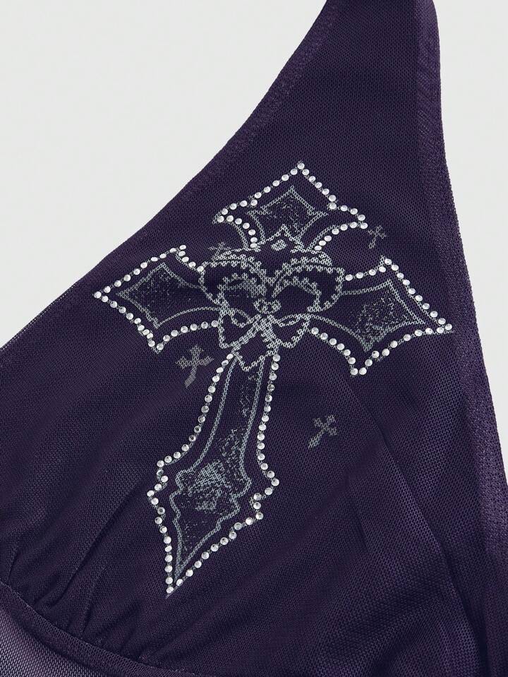 Goth Débardeur croisé pour femmes avec fente latérale en maille incrustée de strass et col ras-du-cou plissé