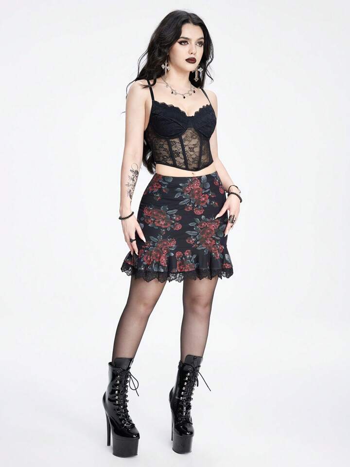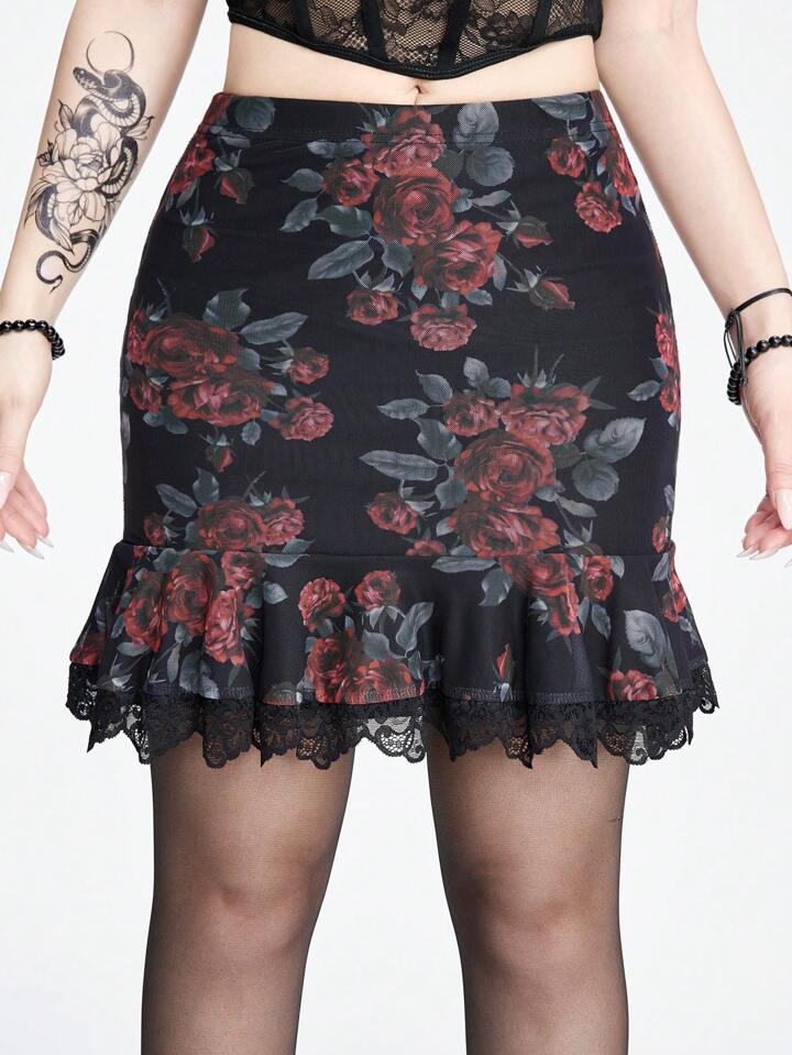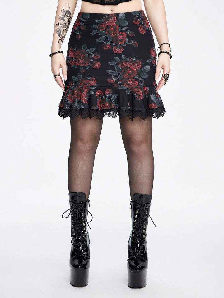 Goth Jupe mi-longue imprimée de vigne de roses pour femmes