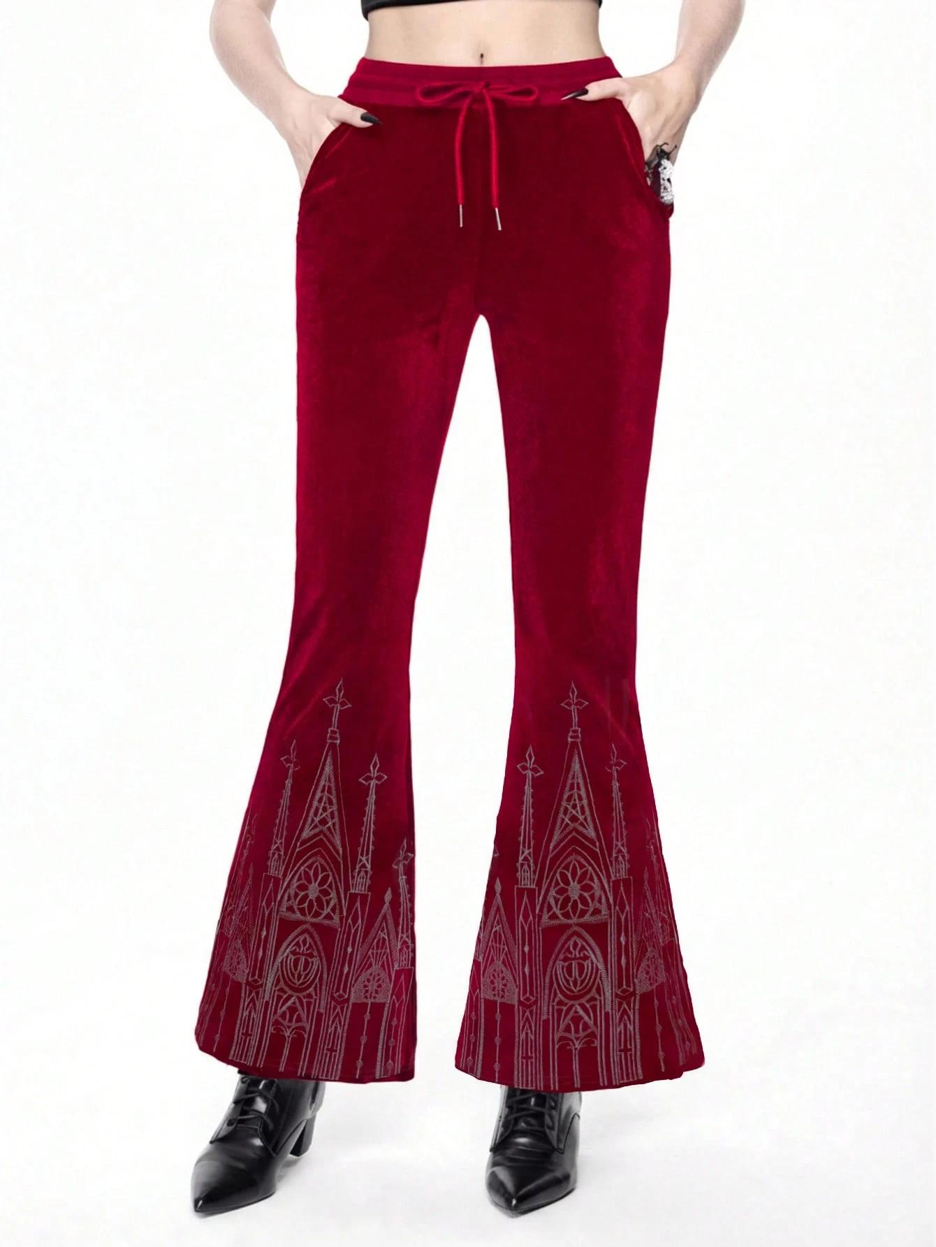 Pantalon évasé en velours à taille élastique avec cordon de serrage, broderie de château gothique pour femmes