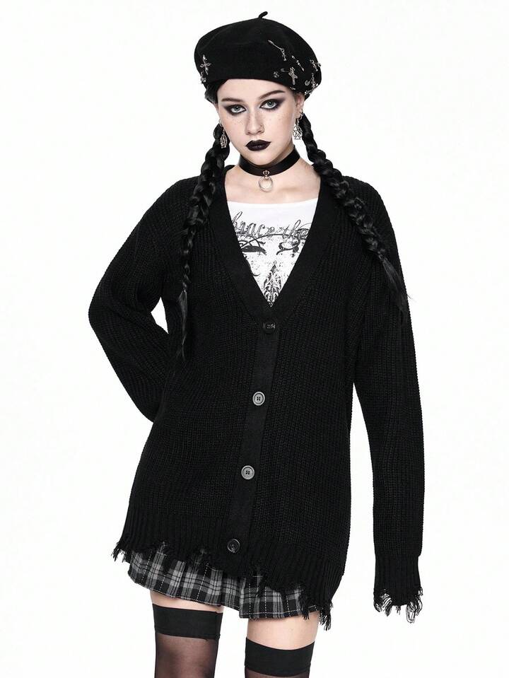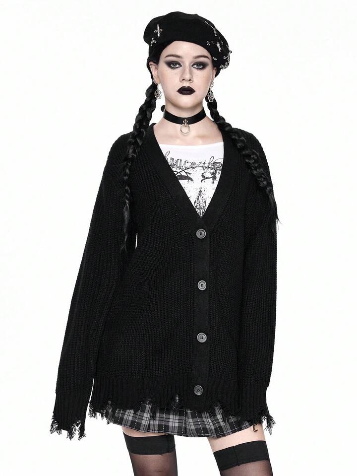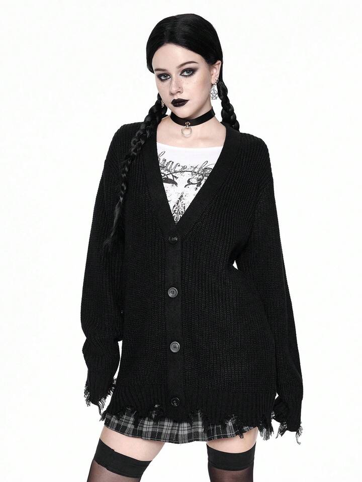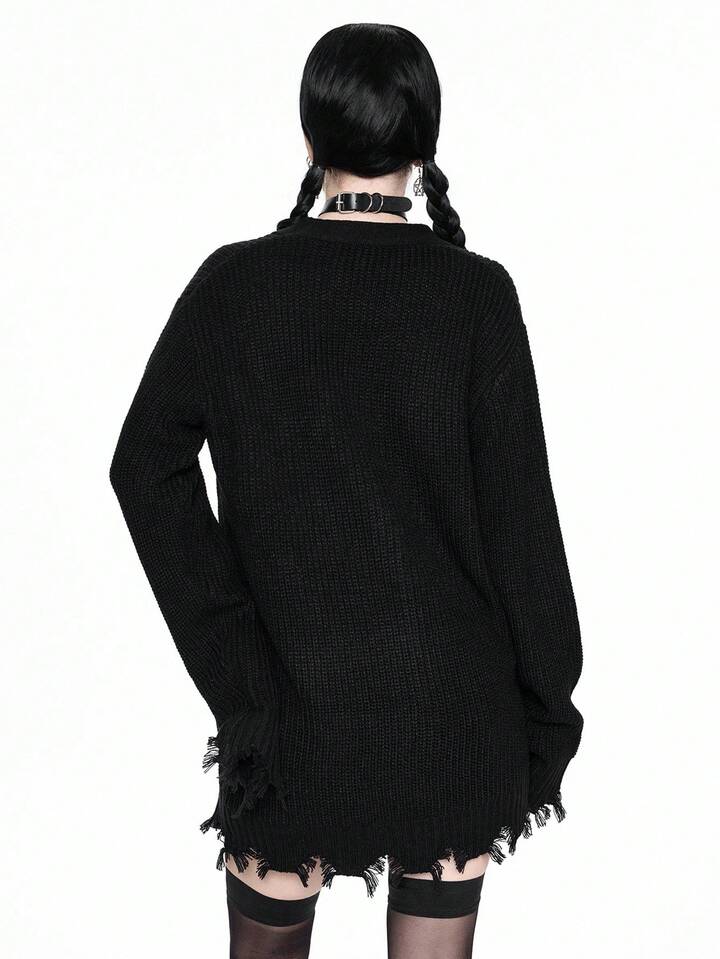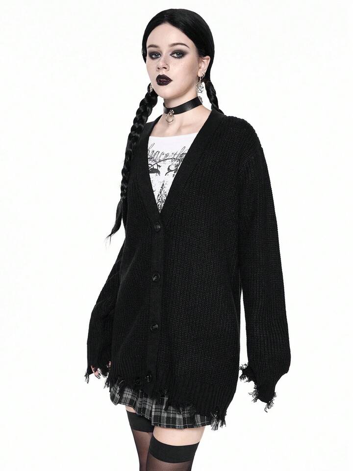 Goth Cardigan en tricot décontracté à col en V et ourlet déchiré pour femmes, ample, veste de dessus, automne/hiver, Halloween