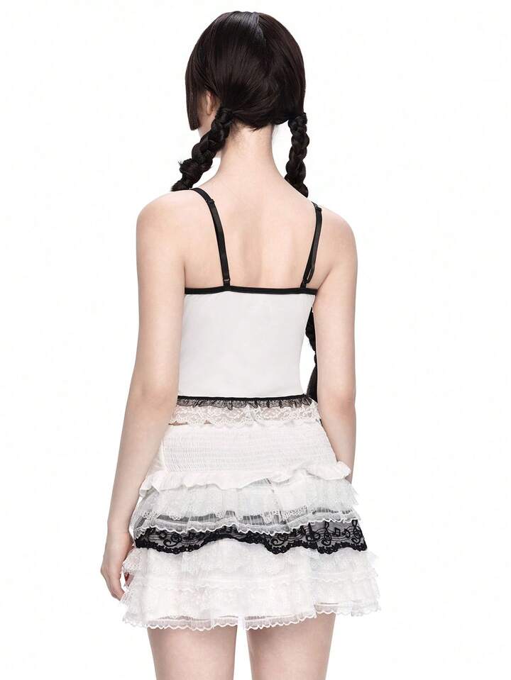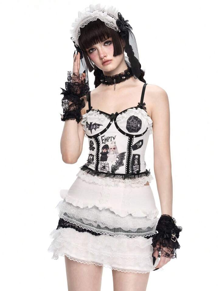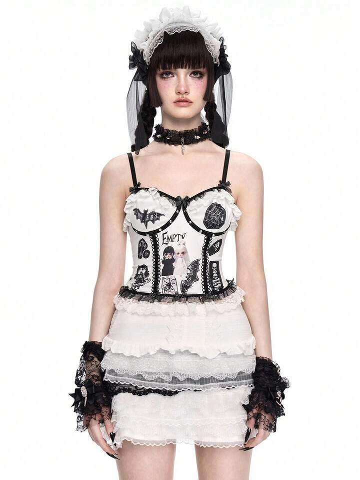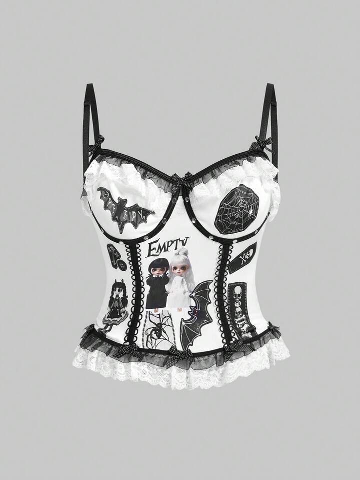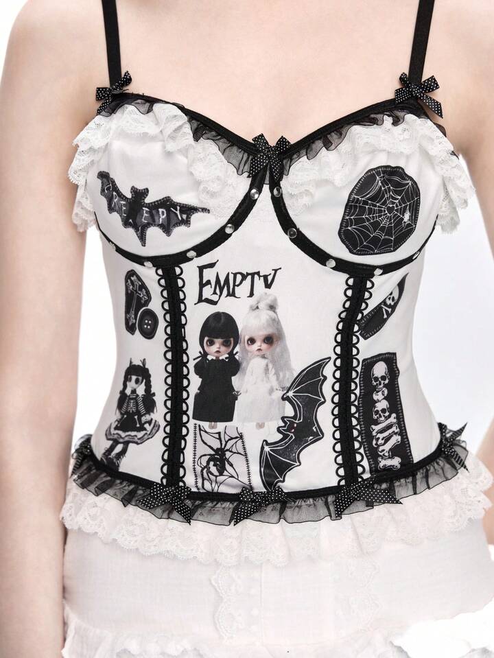 Body transparent avec appliqué de poupée gothique sombre, broderie et dentelle
