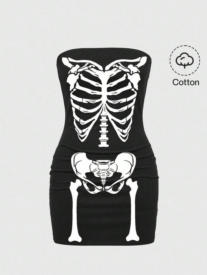Robe gothique noire et blanche pour femmes, style squelette transparent, sans manches, style punk, sexy dos nu, pour Halloween et la Saint-Valentin