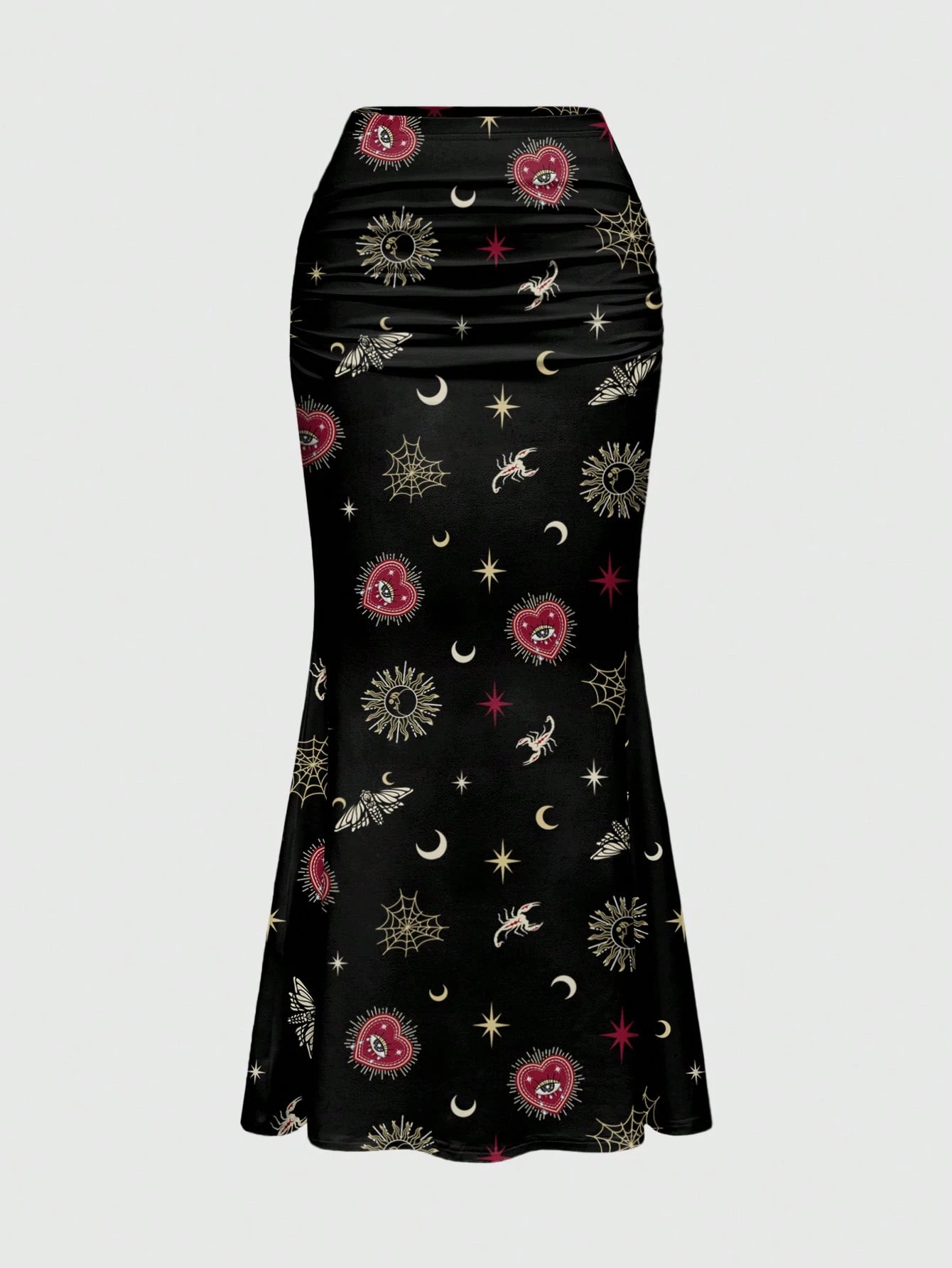 Jupe moulante sirène gothique sombre et mystérieuse avec imprimé soleil, lune et étoiles pour femmes