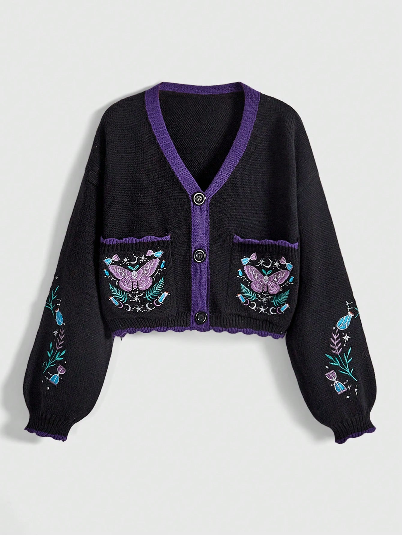 Cardigan gothique sombre et mystérieux avec broderie de cristal de papillon, en couleurs contrastées