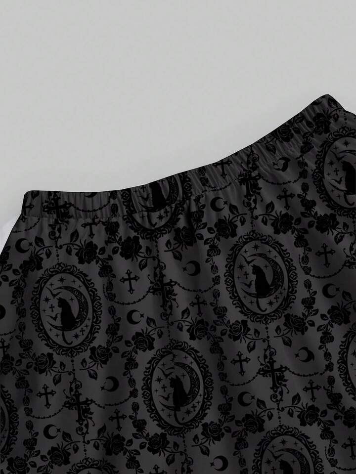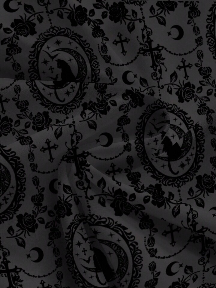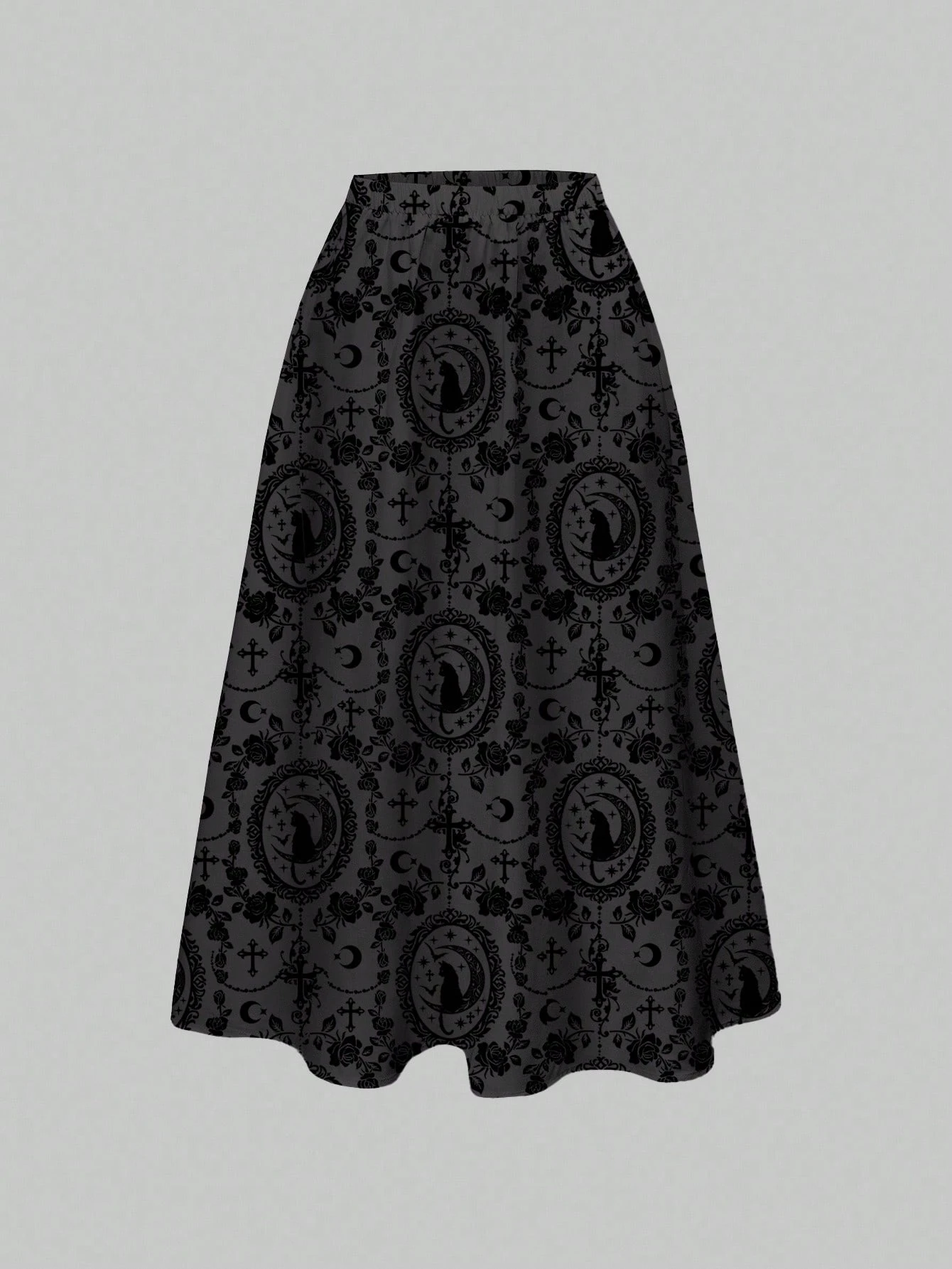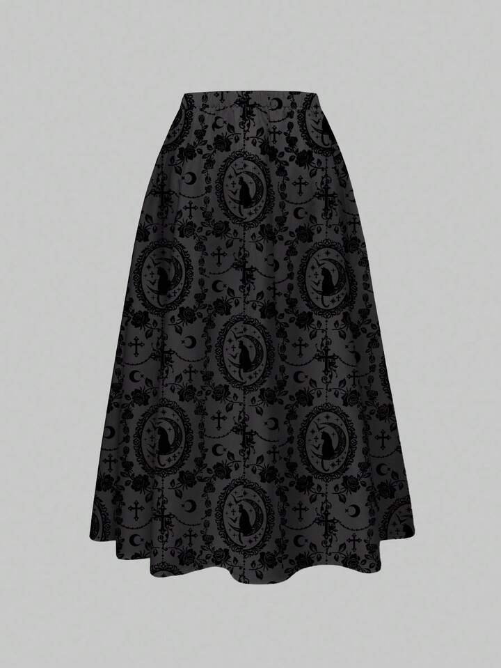 Jupe femme imprimée intégrale gothique, palais sombre, chat noir mystérieux, croix, vigne, rose, soleil, lune, étoile