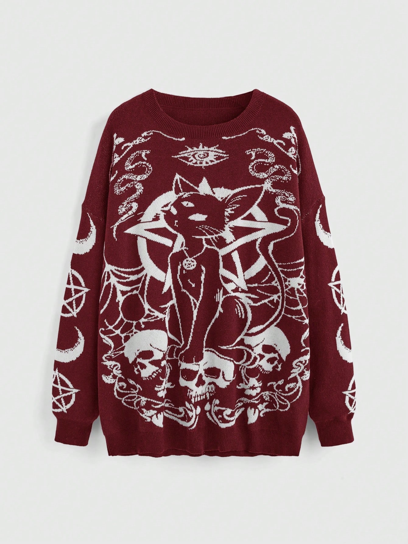 Pullover ample et ample de style gothique sombre avec motif intarsia de chat noir, crâne, étoile, lune et serpent