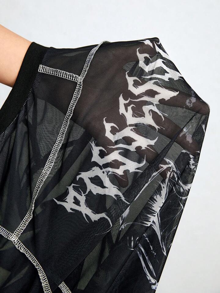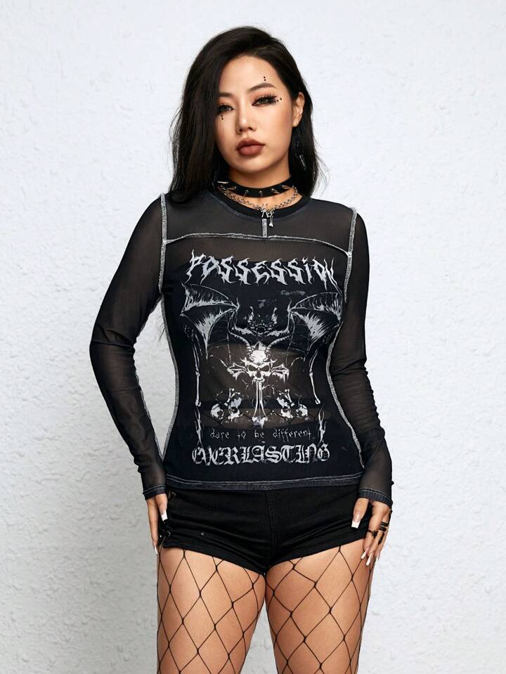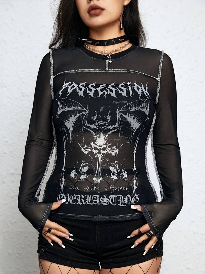 Blouse à mailles transparentes de décoration graphique vintage sombre gothique pour femmes