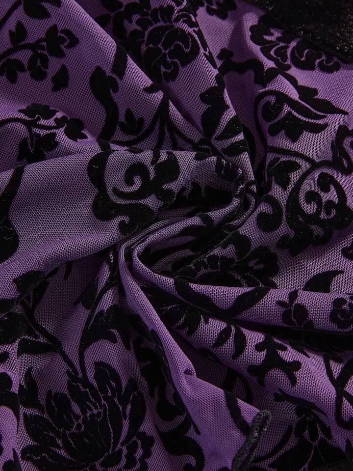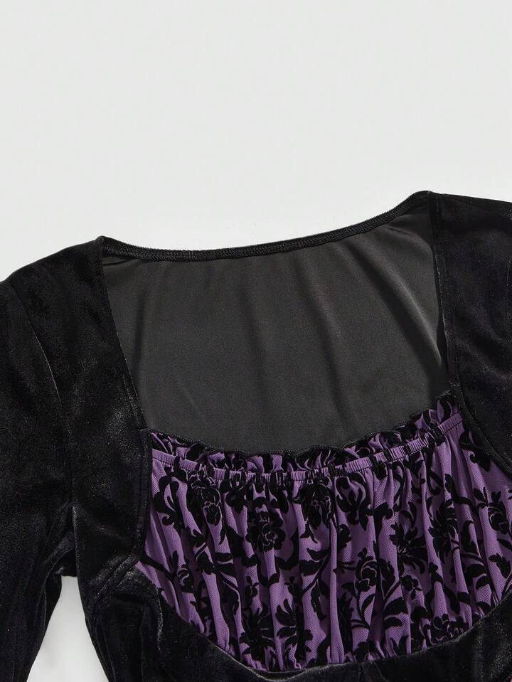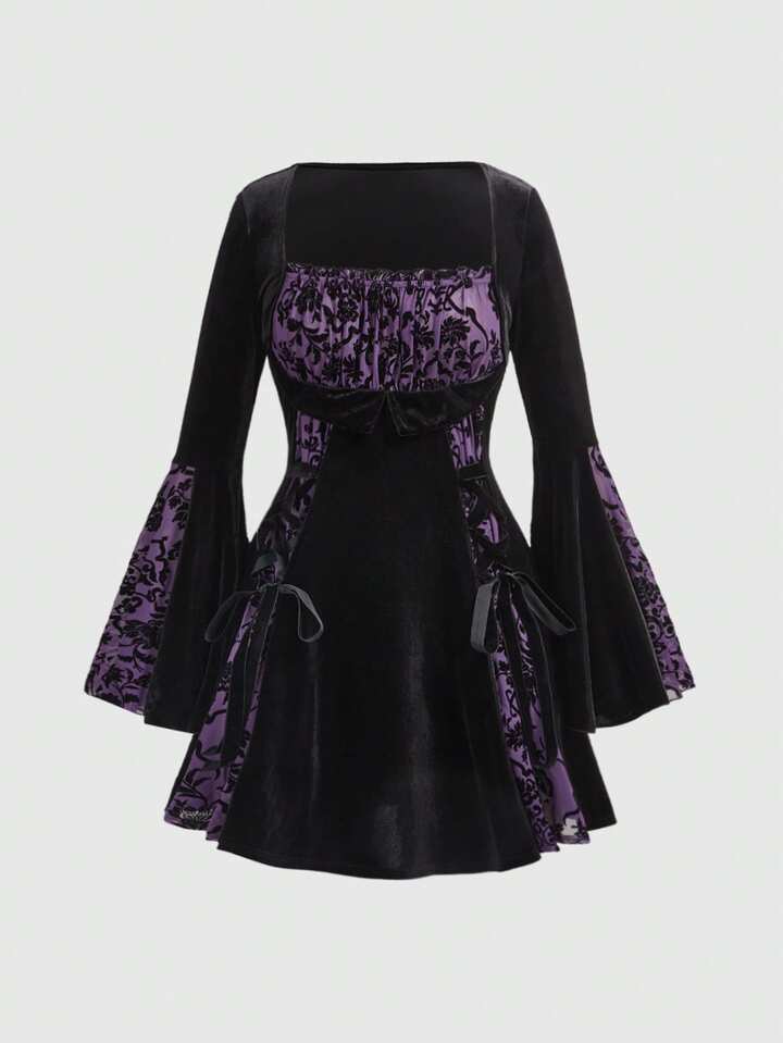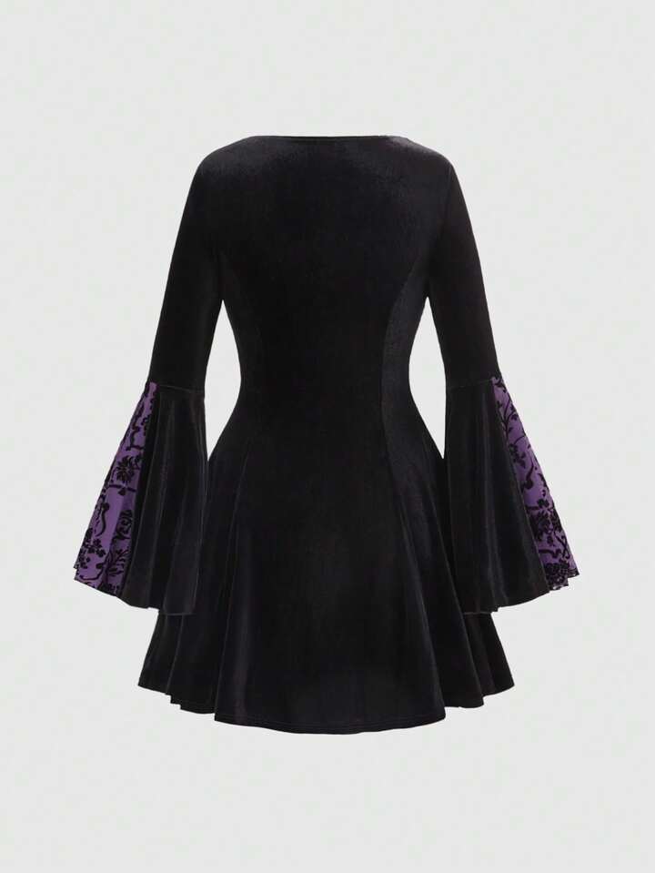 Robe mini en velours à manches évasées avec patchwork floral gothique pour femmes