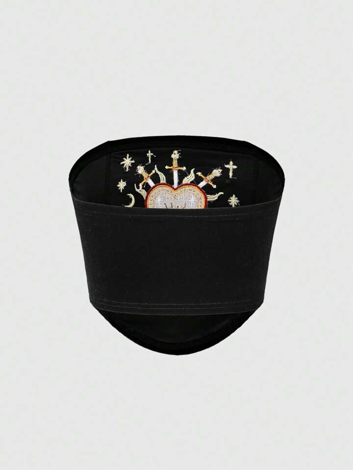 Top court gothique glamour noir avec motifs cousus de cœurs, strass et accents de larmes pour femmes