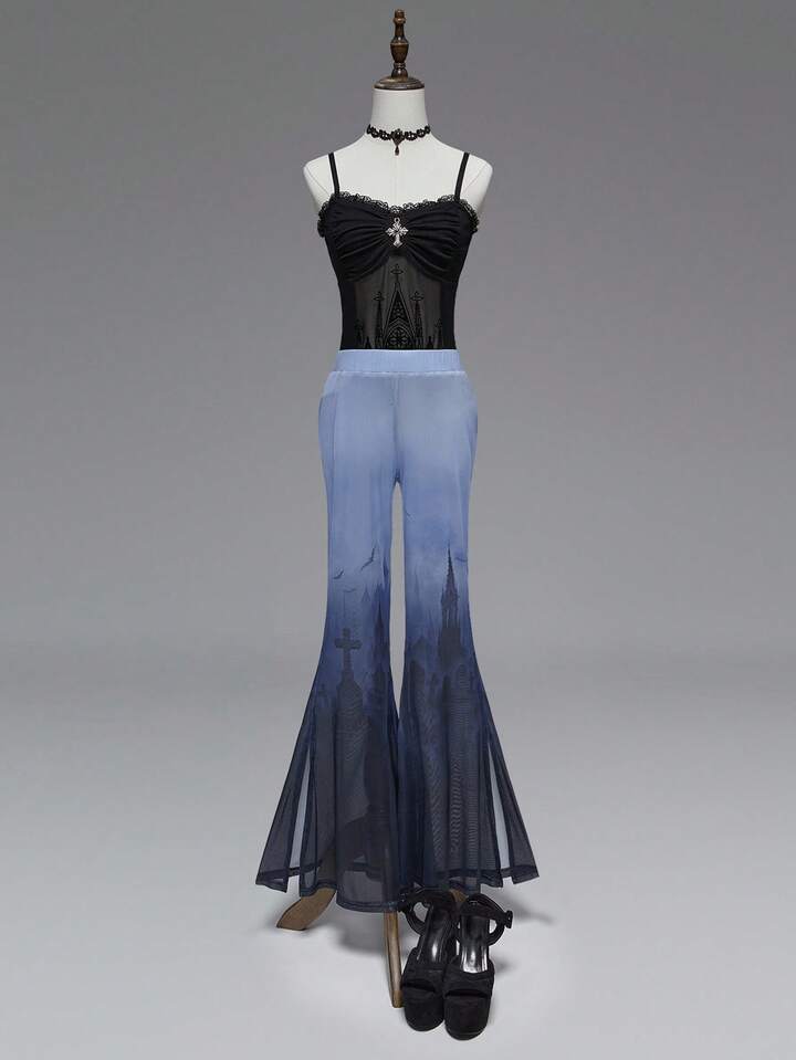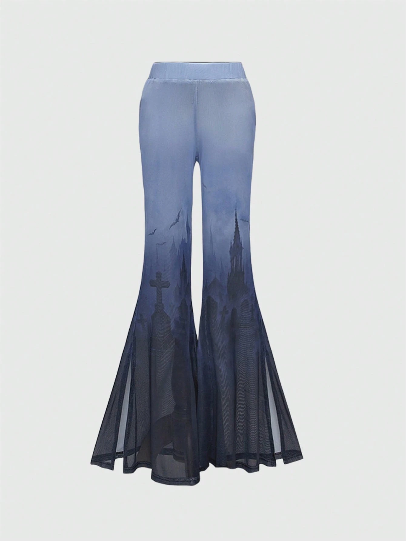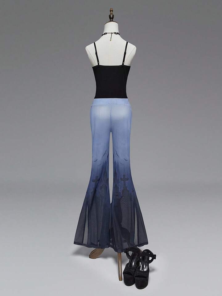 Pantalon évasé transparent à motif de cimetière gothique, Halloween