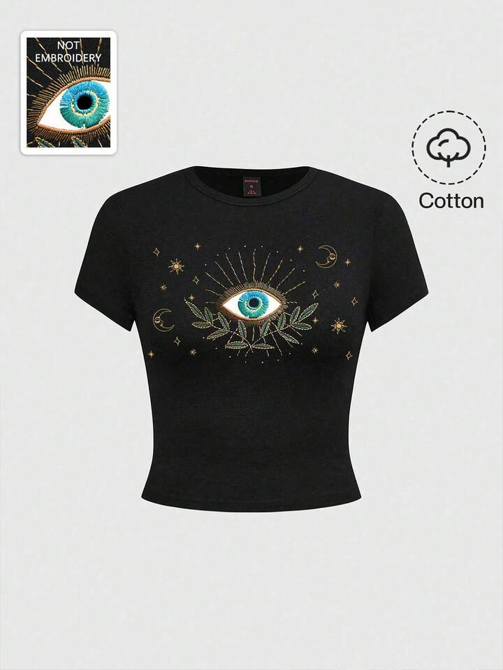 T-shirt noir pour femmes avec imprimé œil gothique mystérieux, soleil et lune