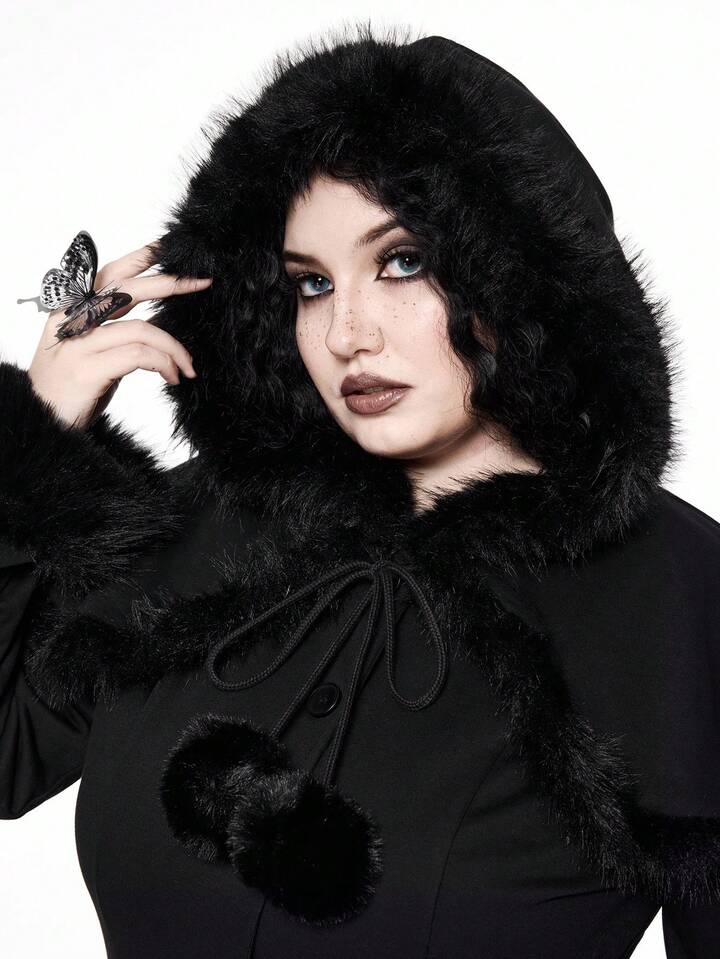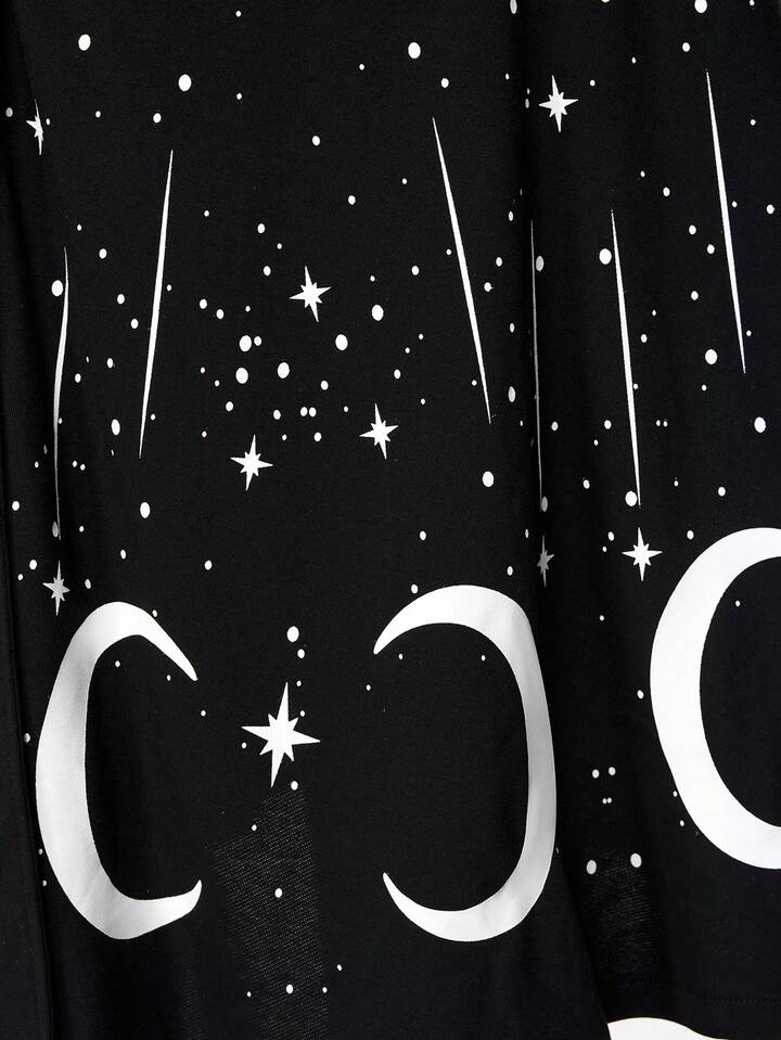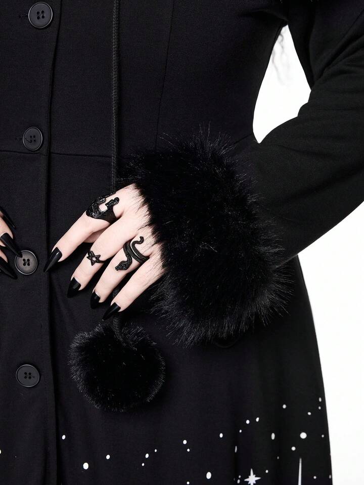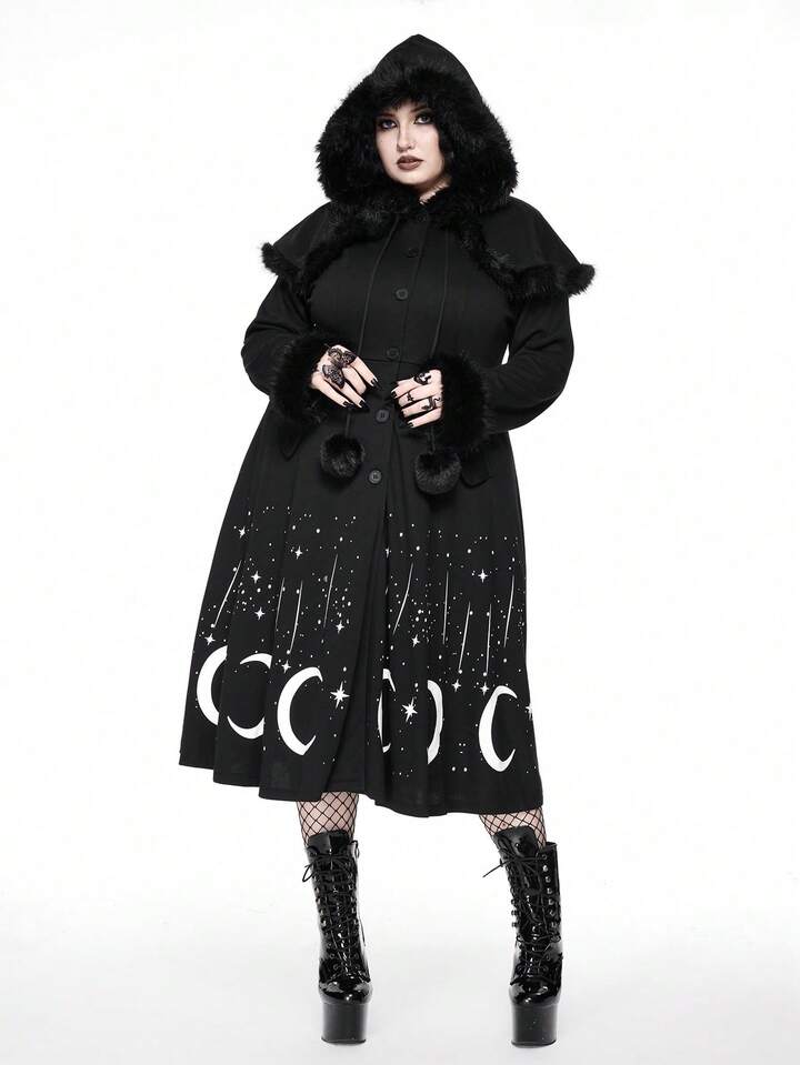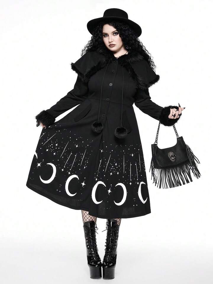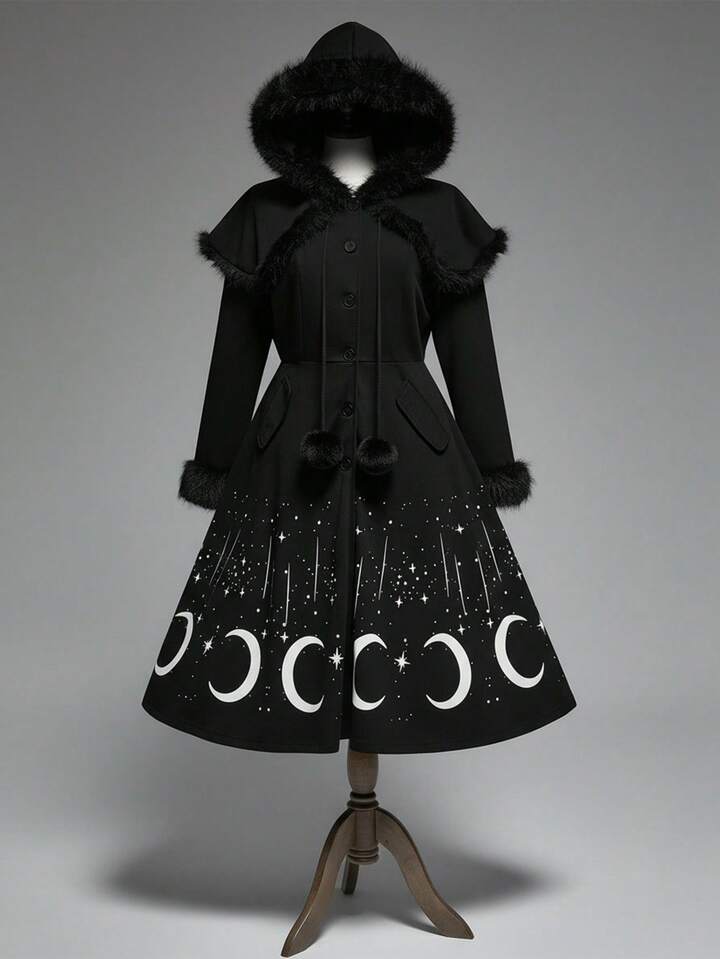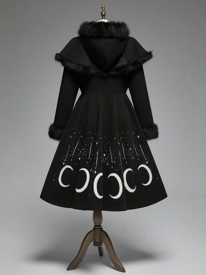 Manteau long gothique rétro imprimé étoiles et lune, noir épais vintage maxi. Vêtement d'extérieur pour femmes grande taille, automne/hiver avec col en fourrure