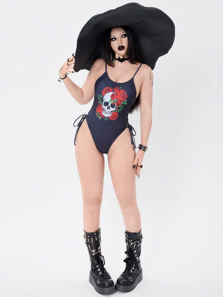 Maillot de bain une pièce avec imprimé crâne et rose gothique, à bretelles réglables, pour Halloween