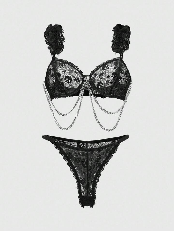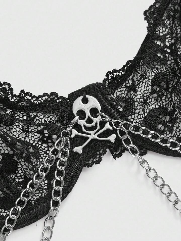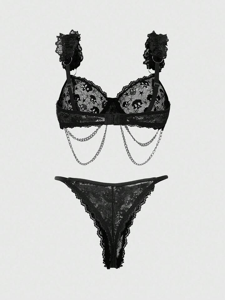 Ensemble de lingerie gothique avec soutien-gorge à armatures avec garniture en dentelle de squelette et string avec garniture de chaîne métallique, sexy pour Halloween