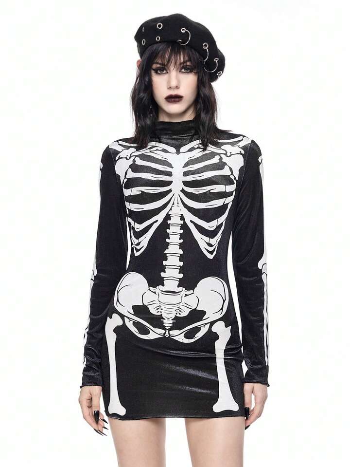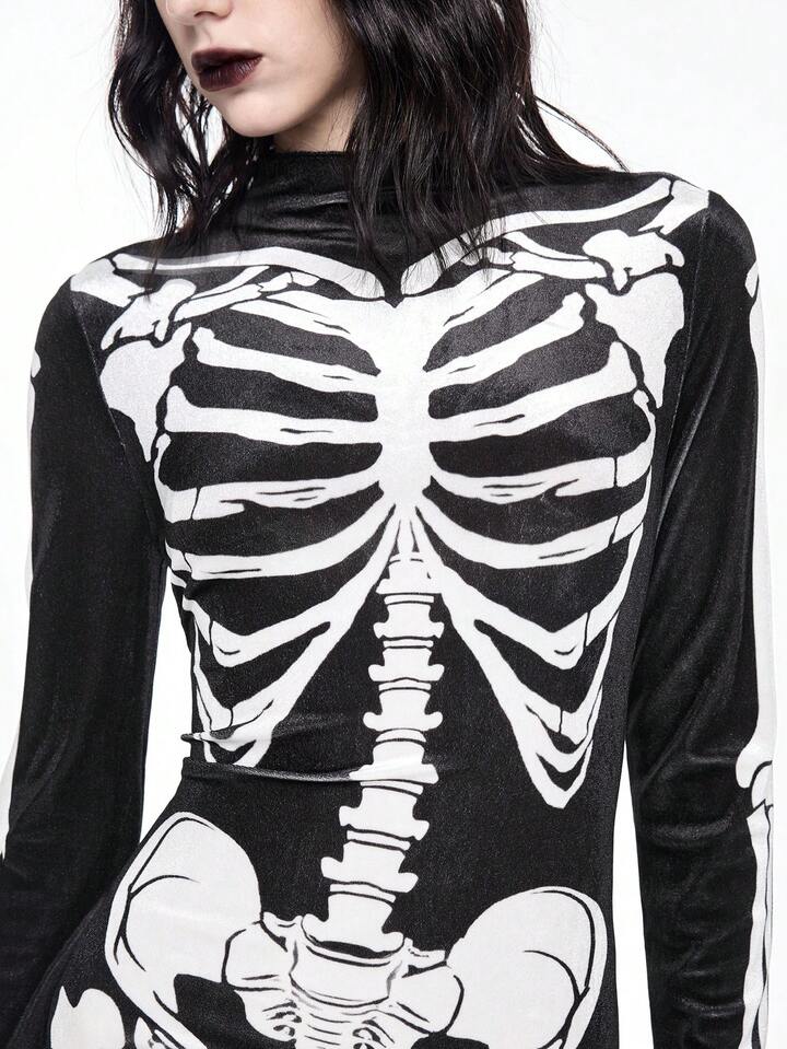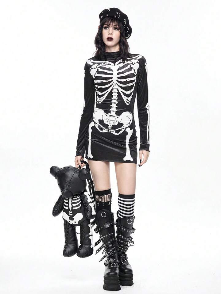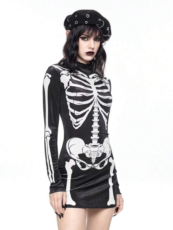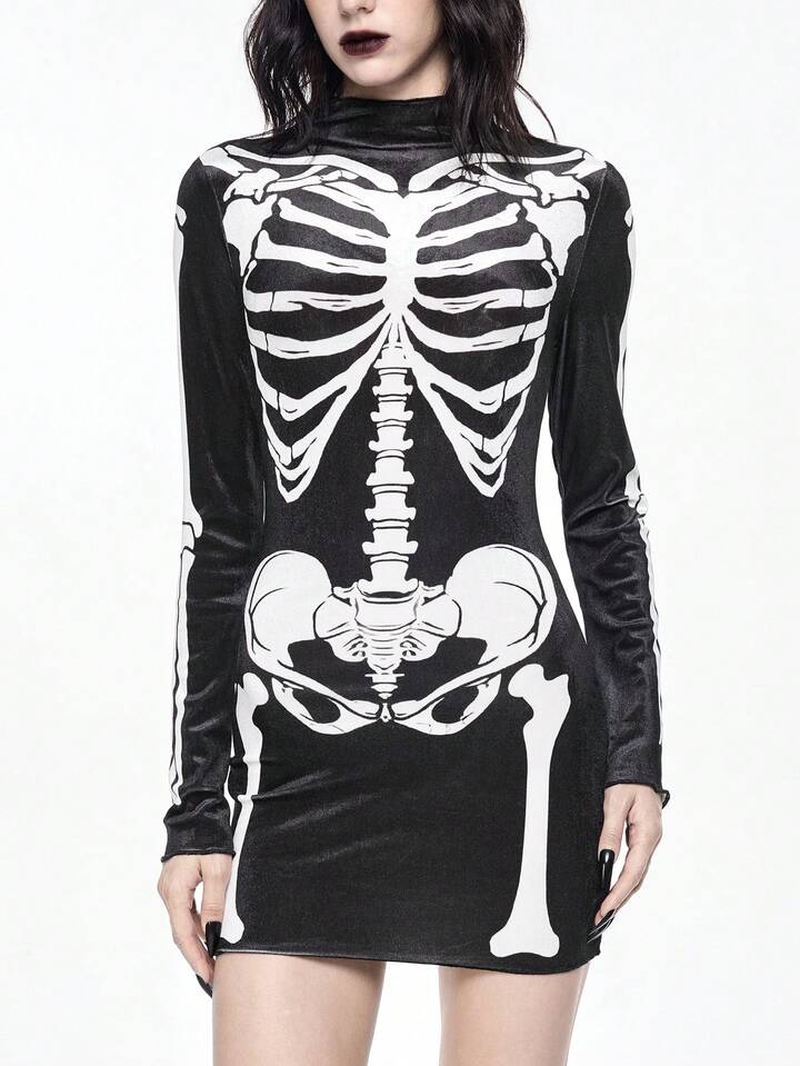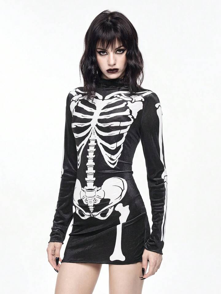 Robe mini en velours noir avec imprimé squelette gothique pour femmes