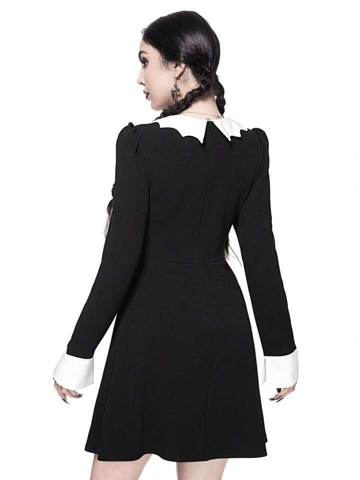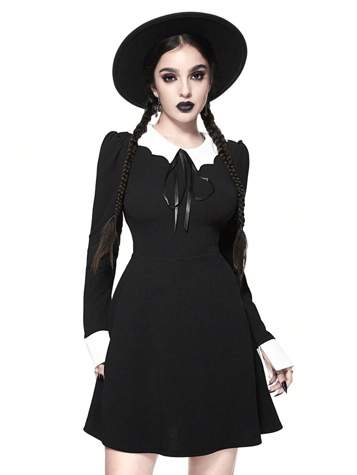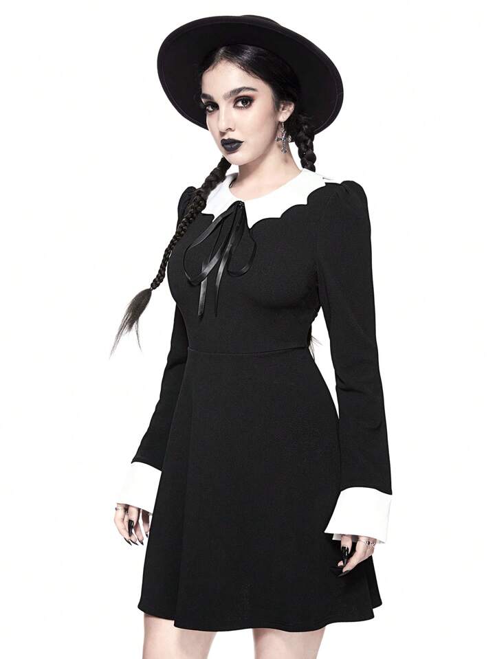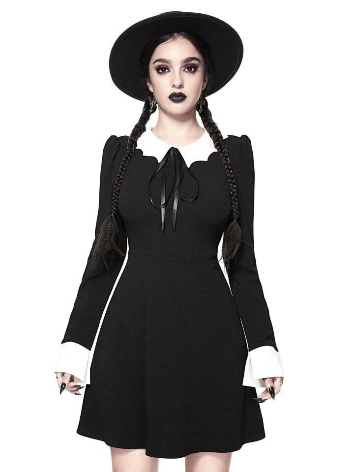 Robe de style gothique pour femmes avec col chauve-souris, nœud papillon à la taille, coupe évasée en A et élastique, pour Halloween