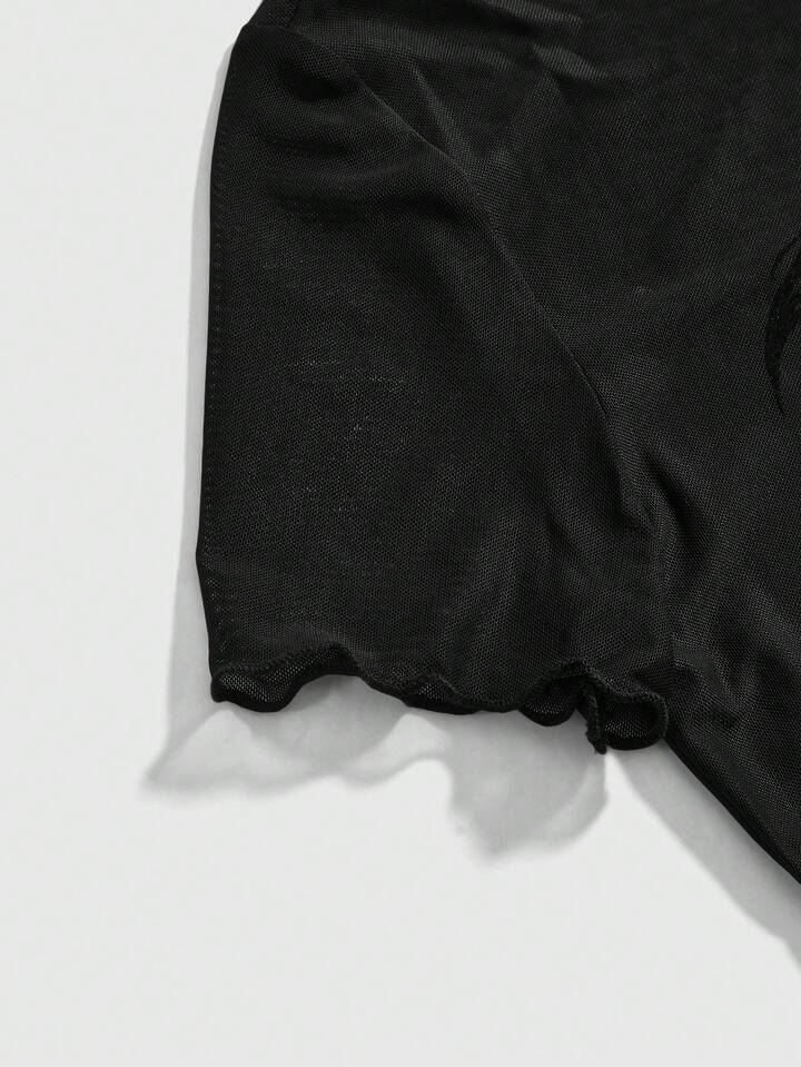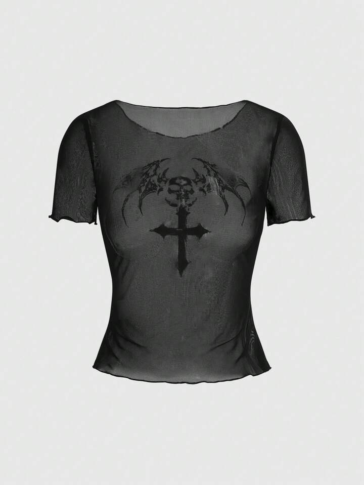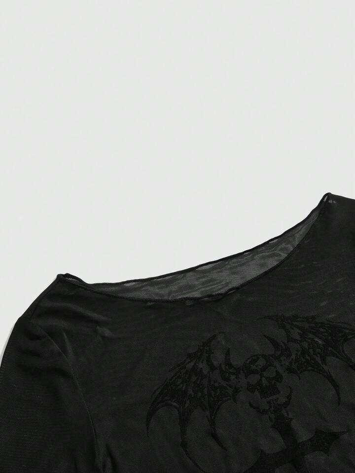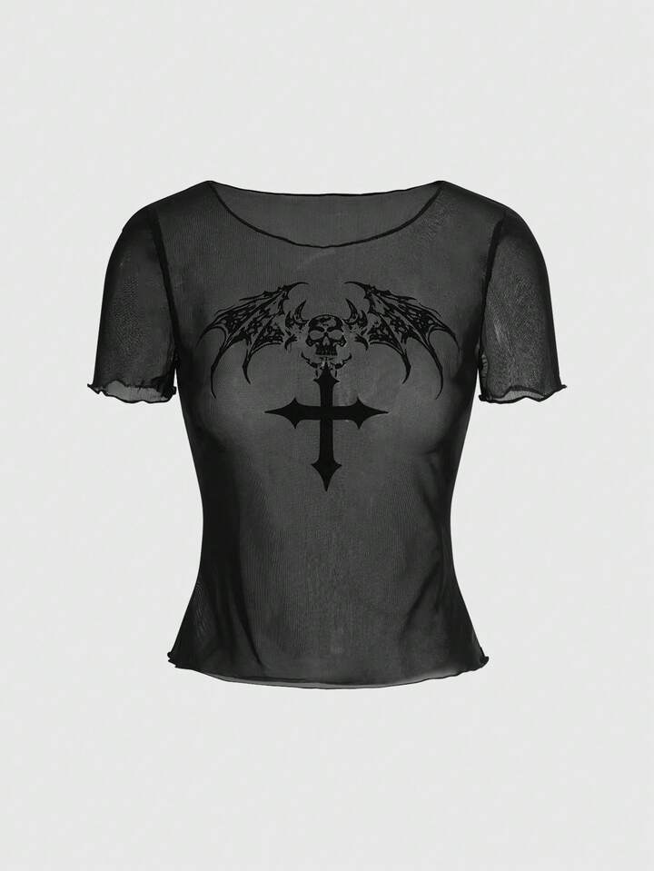 T-shirt femme style gothique avec ailes floquées et crâne