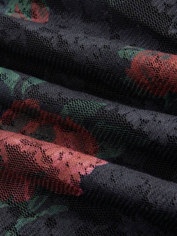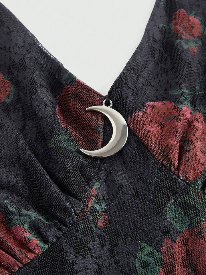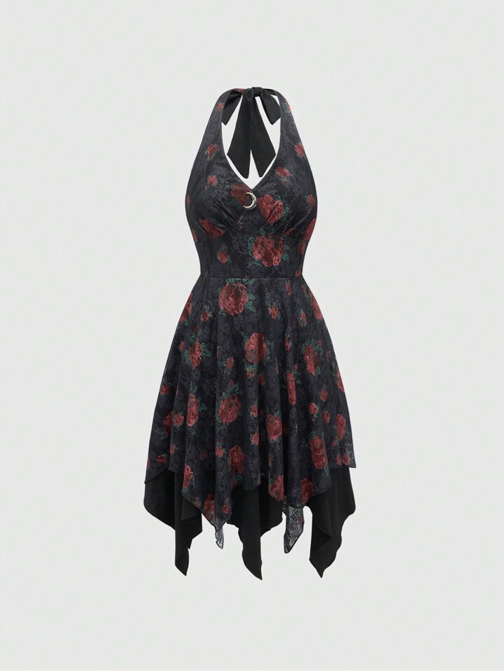 Robe femme style gothique à col ras-du-cou avec imprimé rose et dentelle, coupe asymétrique avec taille cintrée