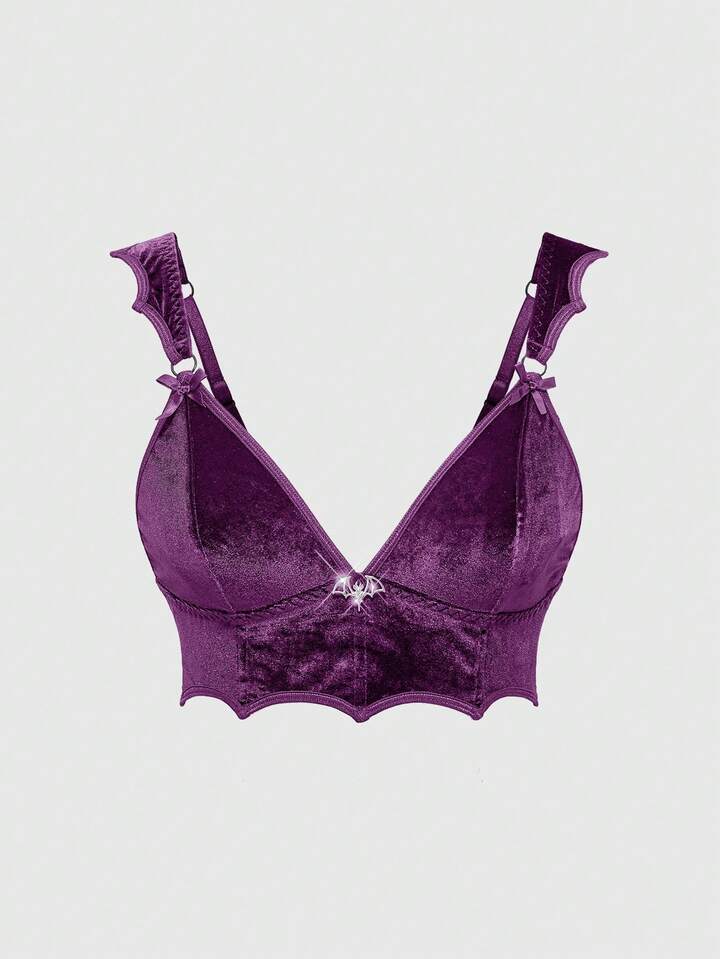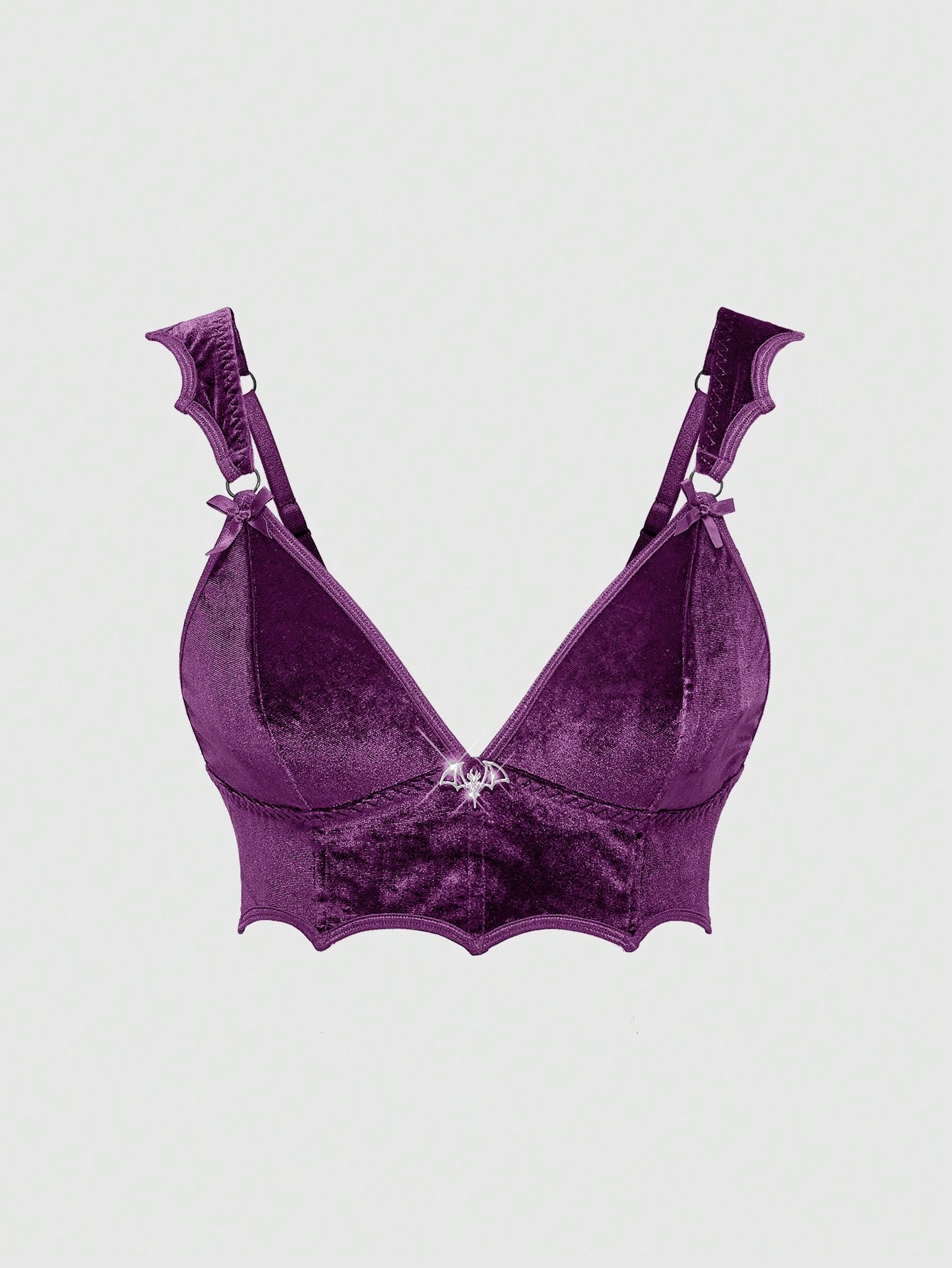 Soutien-gorge sans fil de style gothique en velours avec pendentif en métal en forme de chauve-souris et coupe triangulaire