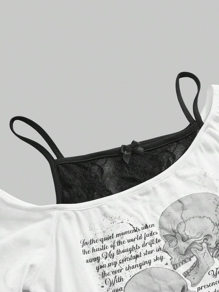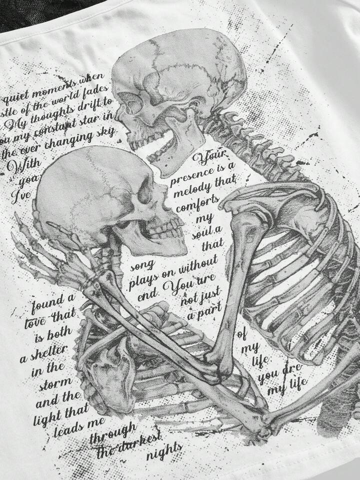 T-shirt gothique vintage Y2K pour femme à manches courtes, avec impression squelette enlaçant et patchwork de dentelle