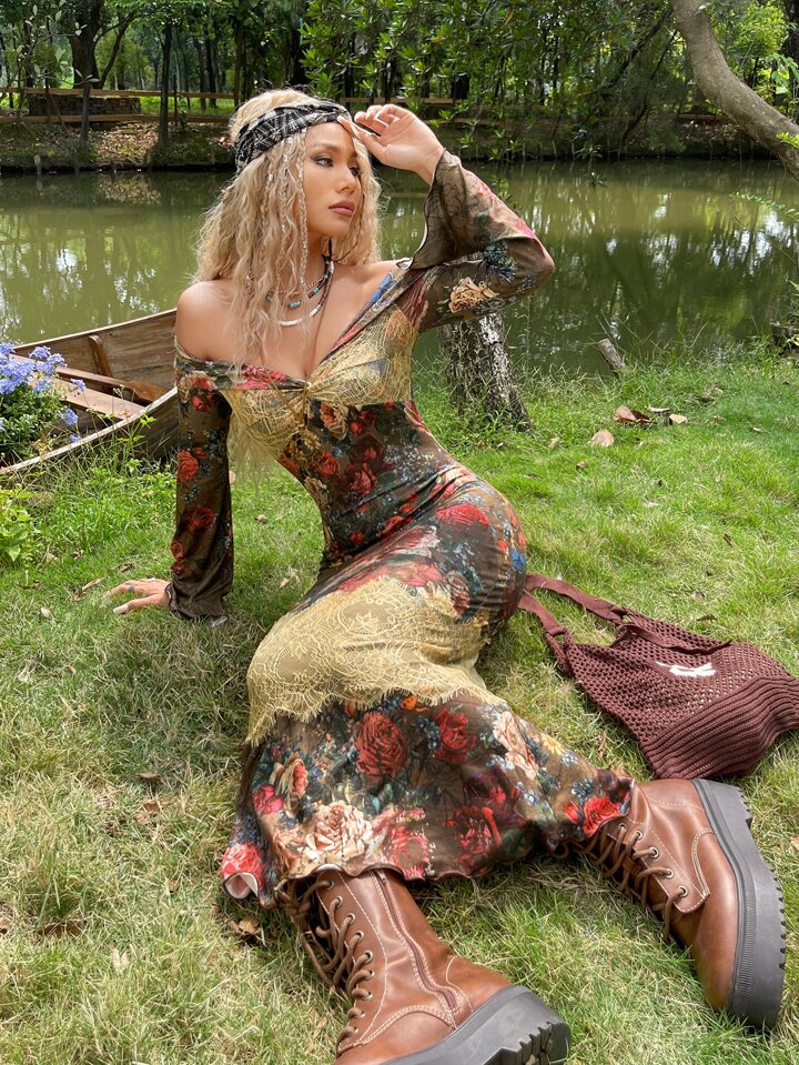 Robe grunge à imprimé floral col bardot torsadé en dentelle