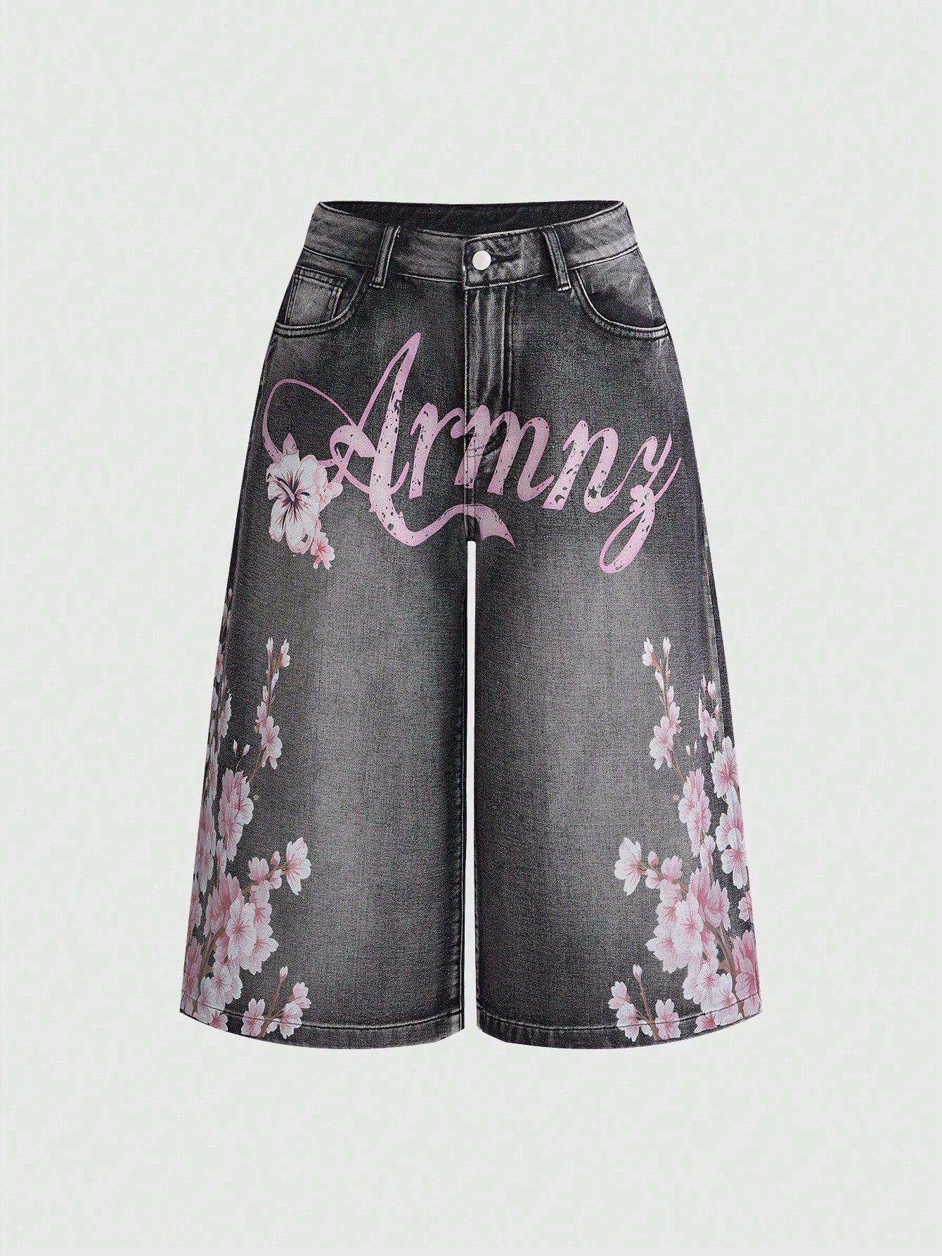 Grunge Punk 2026 Pantalon Capri en jean d'été pour femmes, design imprimé Sakura et lettres, short en jean à jambe droite ample