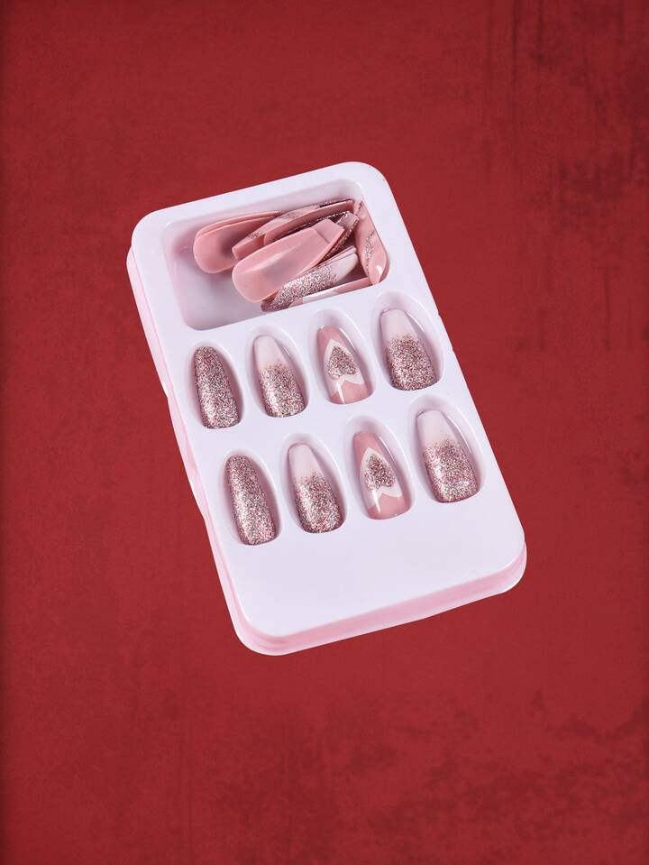 Grunge Punk 24 pièces Faux ongles long cercueil avec motif cœur scintillant & 1 feuille ruban