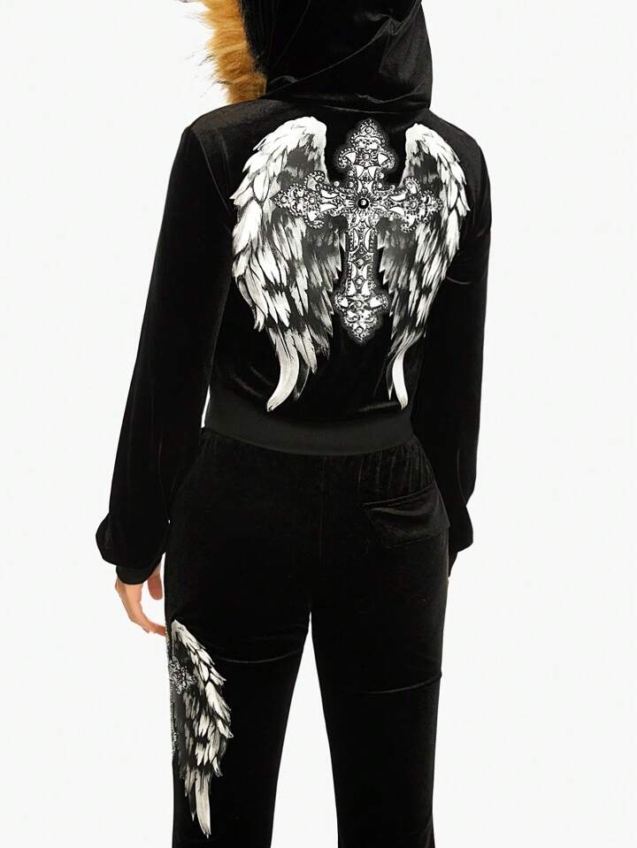 Grunge Punk 2 pièces Ensemble de survêtement en velours avec décoration de strass en forme d'aile et de croix style PUNK Y2K Baddie pour femme, automne/hiver