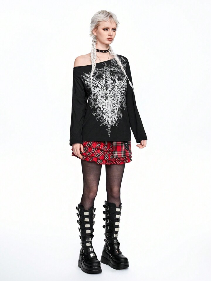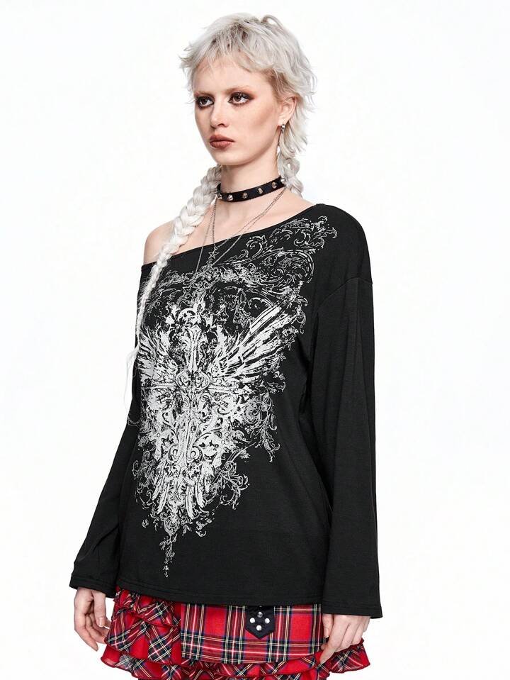Grunge Punk T-shirt vintage à col asymétrique avec impression de strass en forme d'aile de vigne