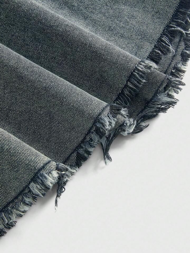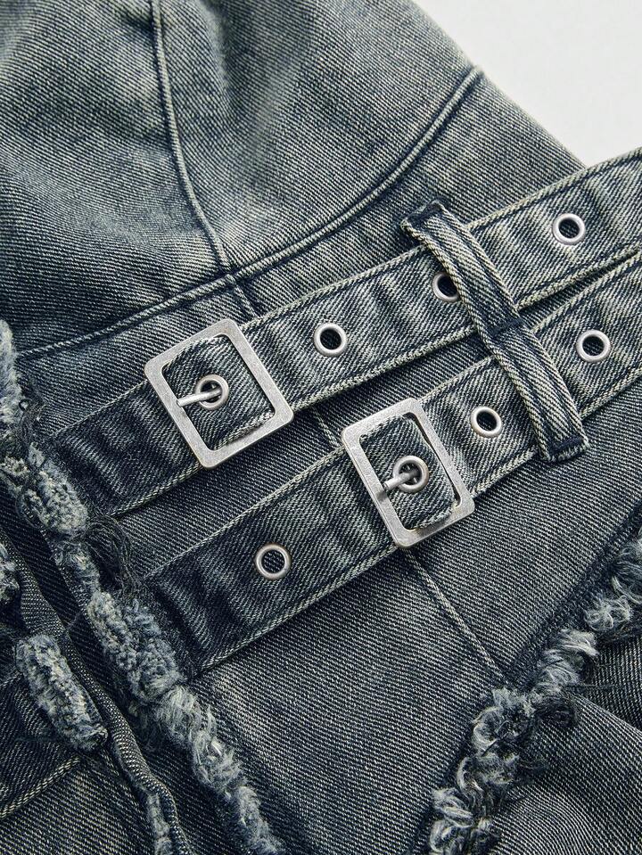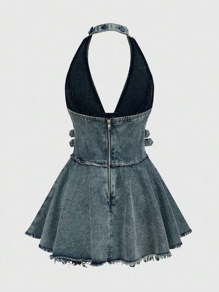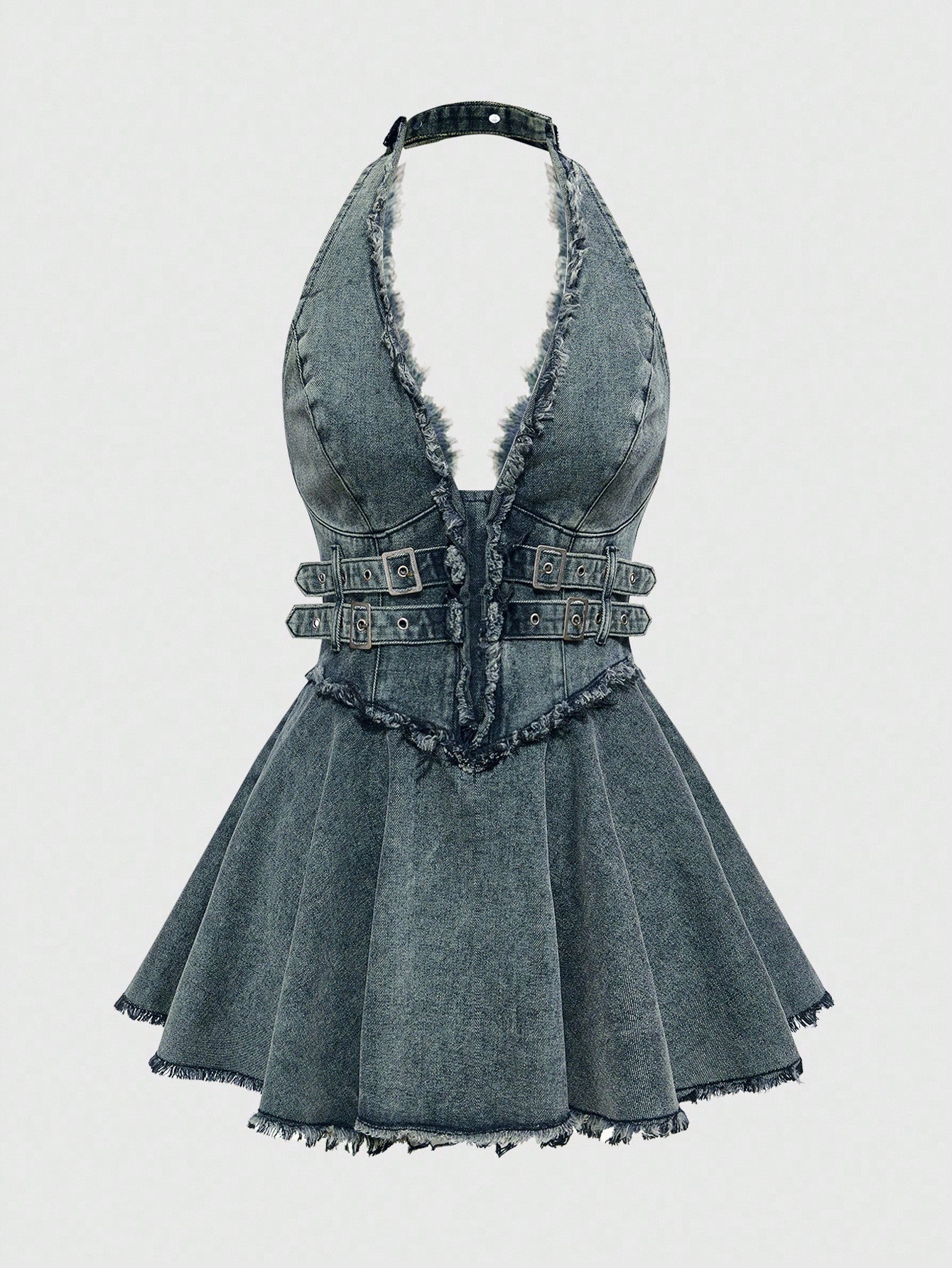 Grunge Punk Robe débardeur en jean mini super avec ourlet volants effet délavé et effiloché, épaules découvertes, bleu clair