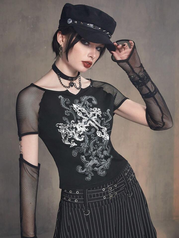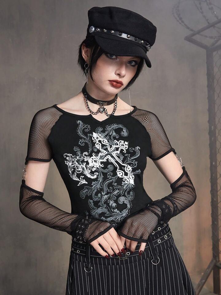 Grunge Punk T-shirt Croisé Graphique Avec Tulle