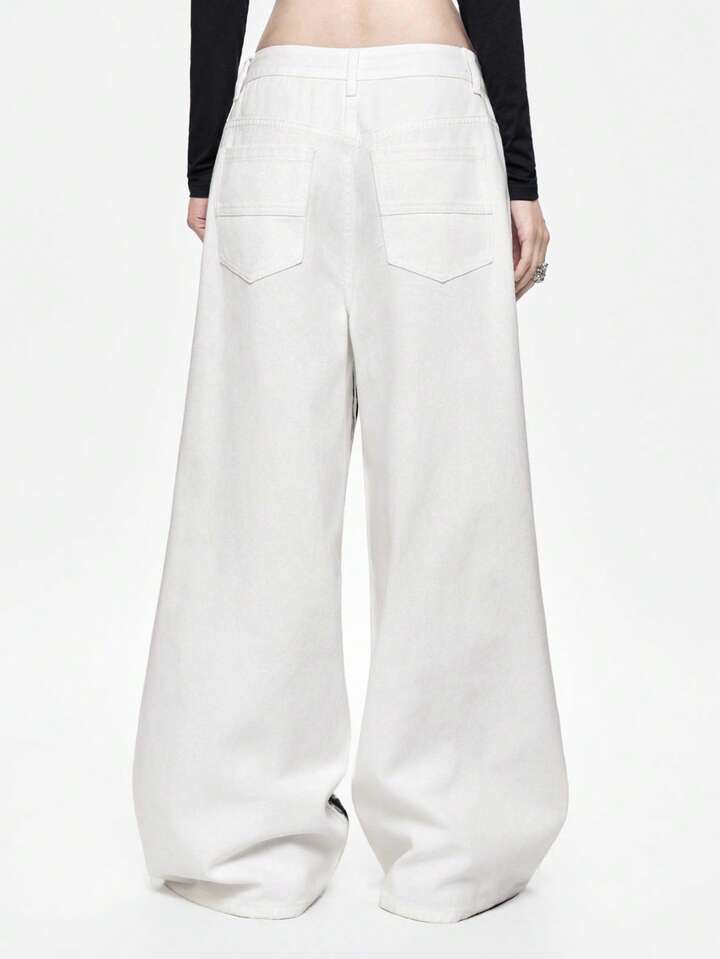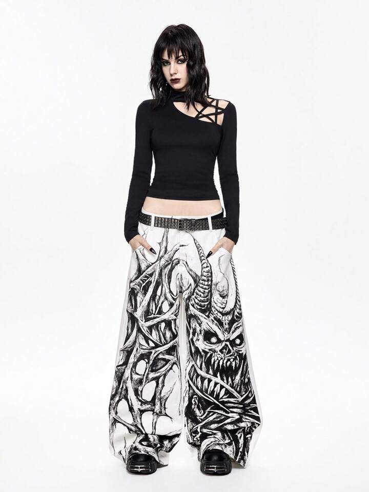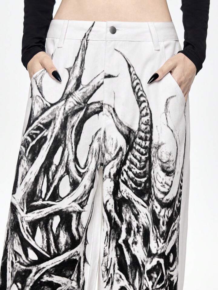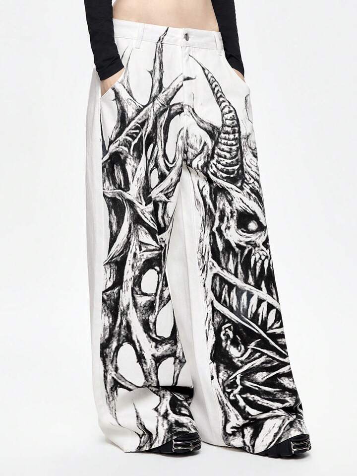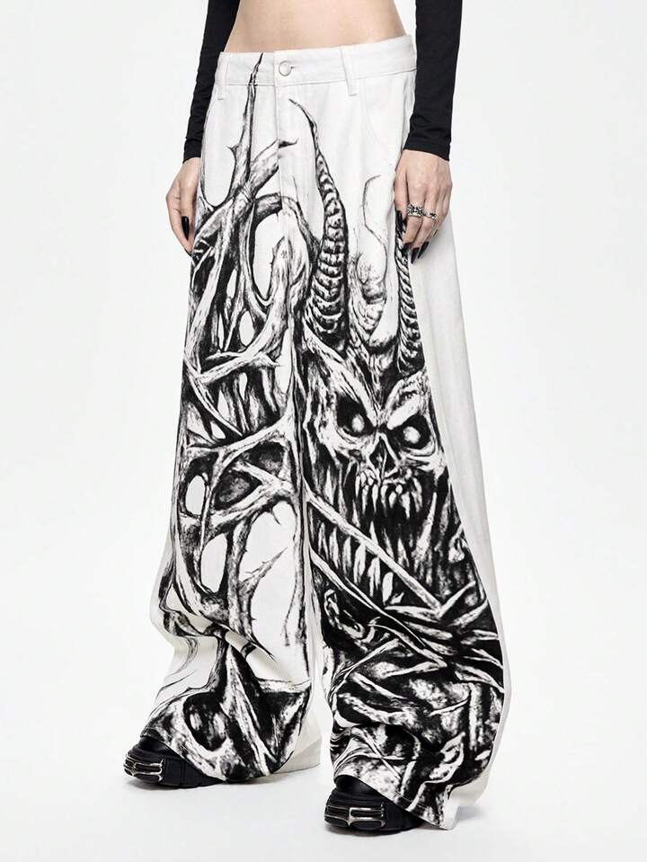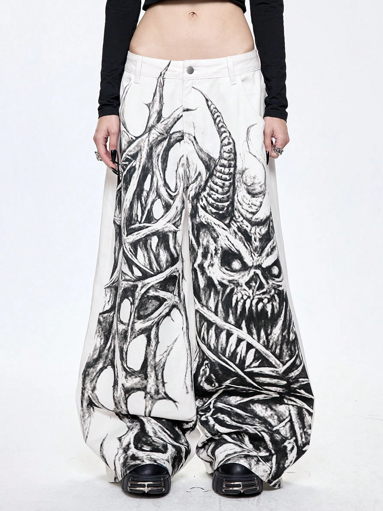 Grunge Punk Jeans à taille basse et jambes larges avec imprimé sombre