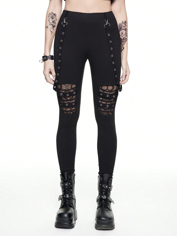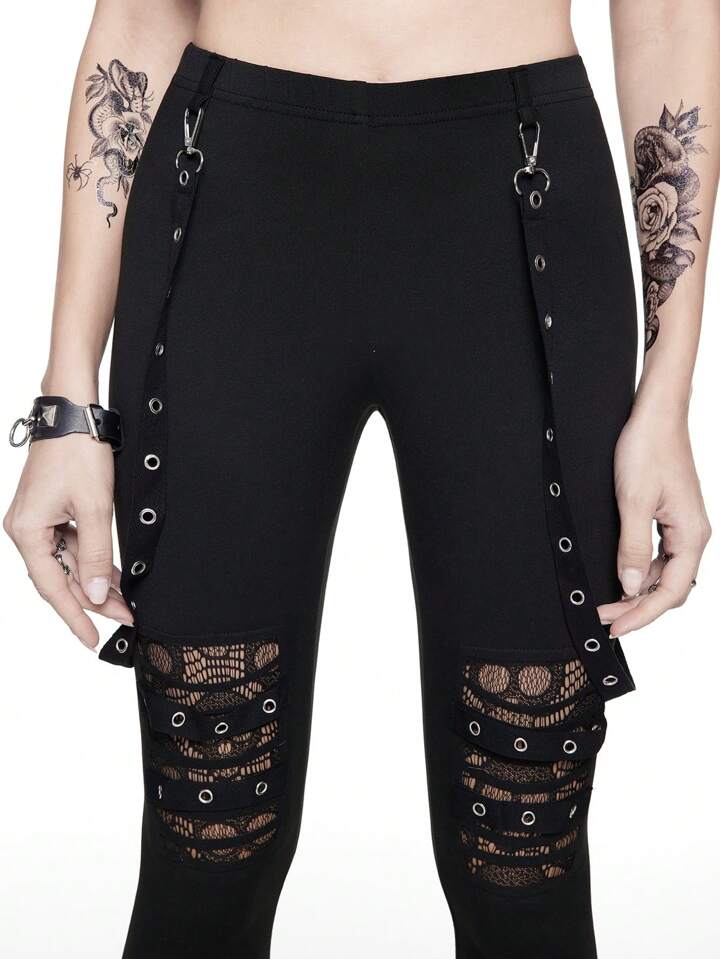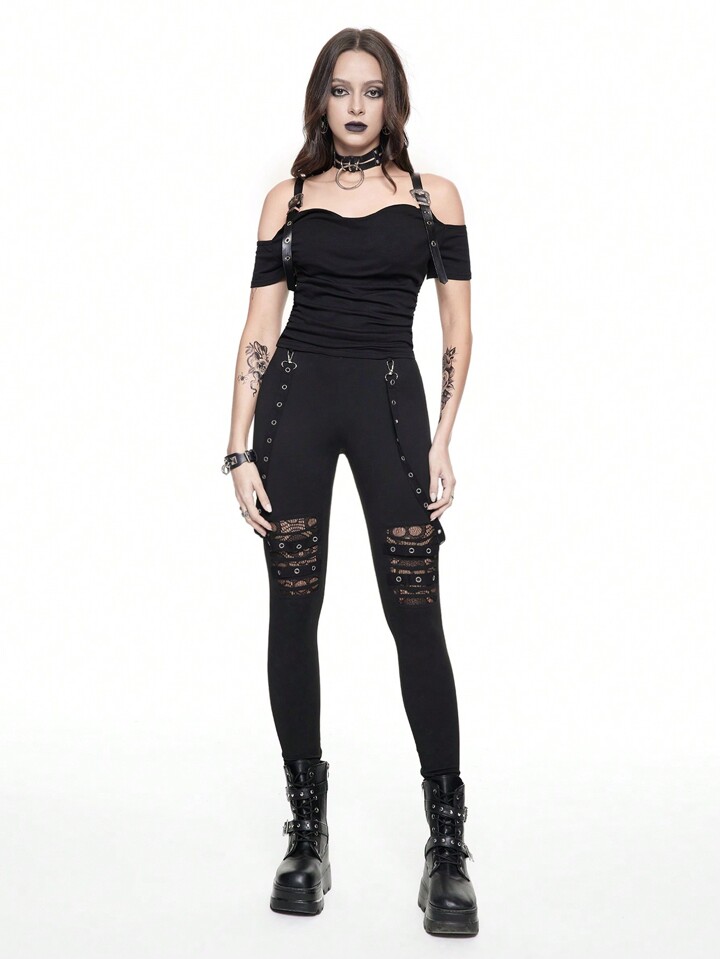 Grunge Punk Leggings skinny avec boucle métallique ajourée style punk foncé et sangle de taille amovible pour femmes