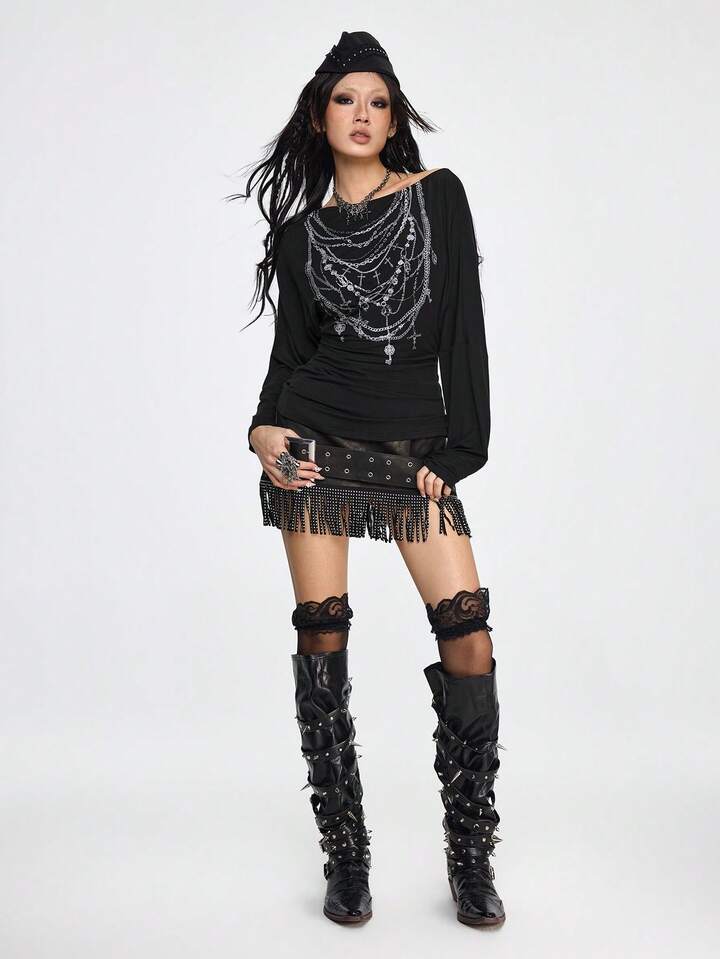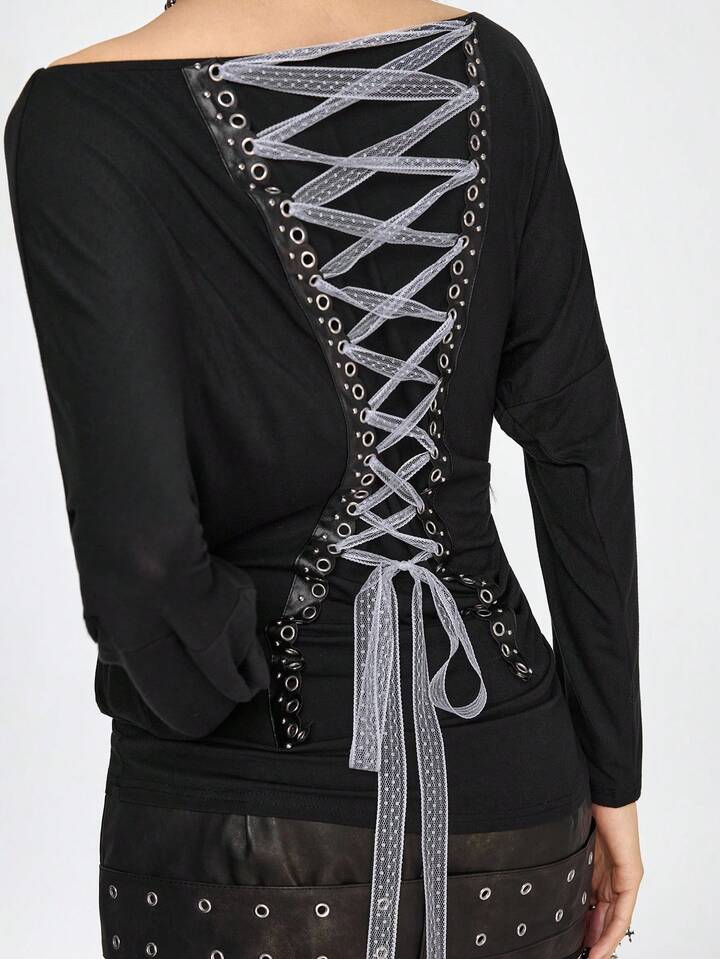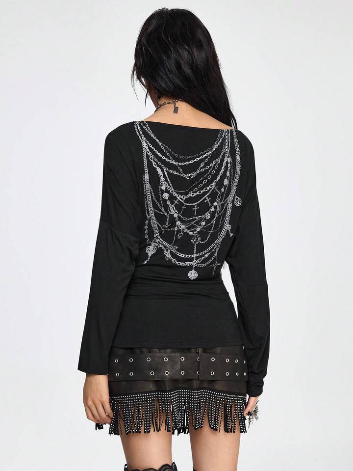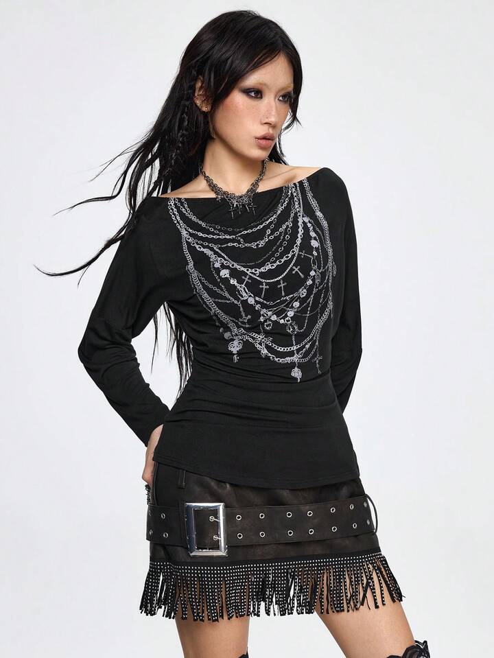 Grunge Punk T-shirt à manches longues avec imprimé punk sombre et épaules dénudées avec lien, top polyvalent pour superposition