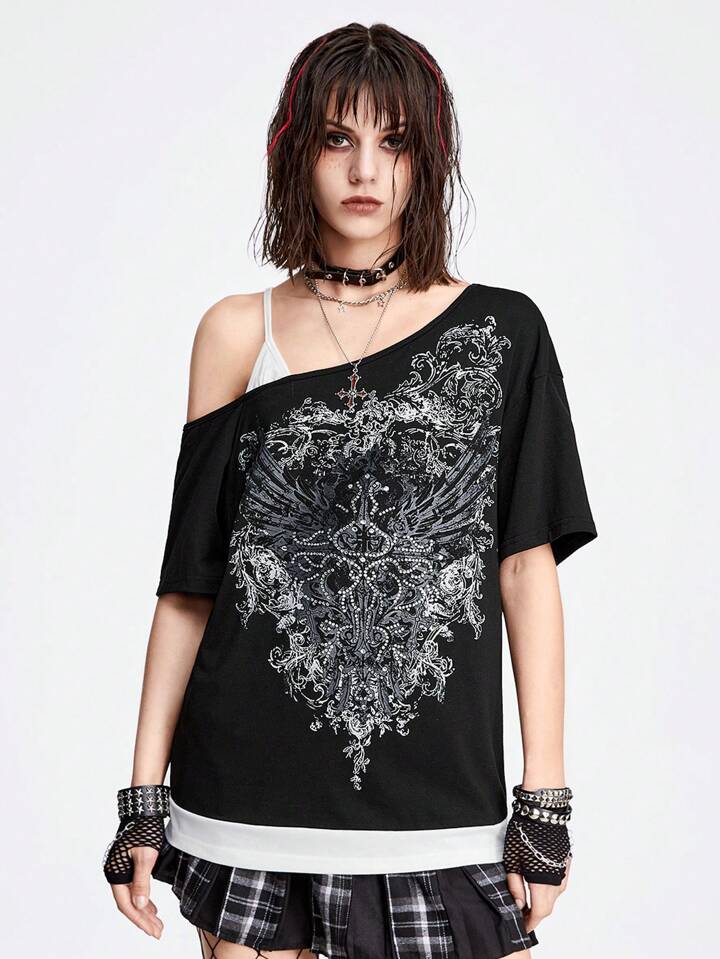 Grunge Punk T-shirt femme oversize de style punk sombre avec impression asymétrique à l'épaule et motif d'aile, pour l'école