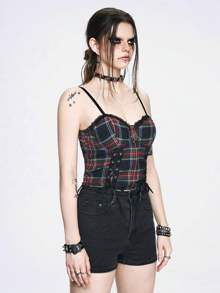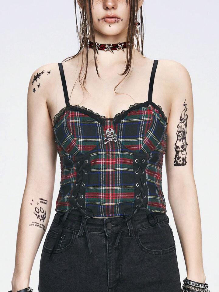 Grunge Punk Haut de camisole à carreaux rouge foncé et vert avec dentelle et nœud en ruban pour femmes