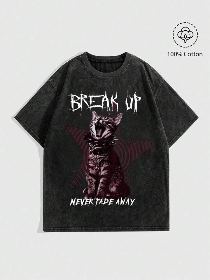 Grunge Punk T-shirt oversize délavé décontracté pour femmes avec un graphique de chat, effet brumeux, idéal pour la remise de diplômes
