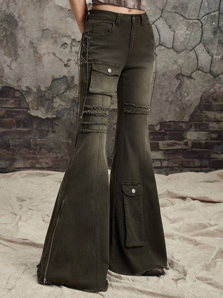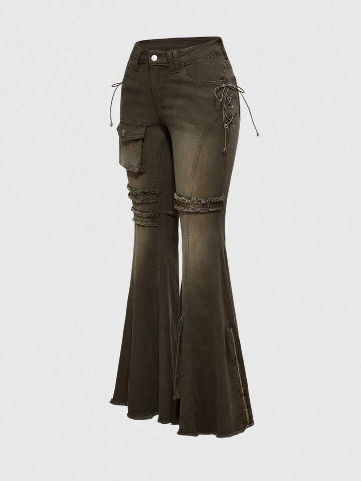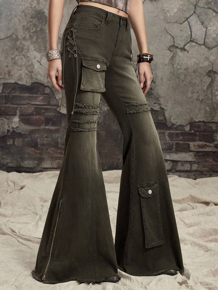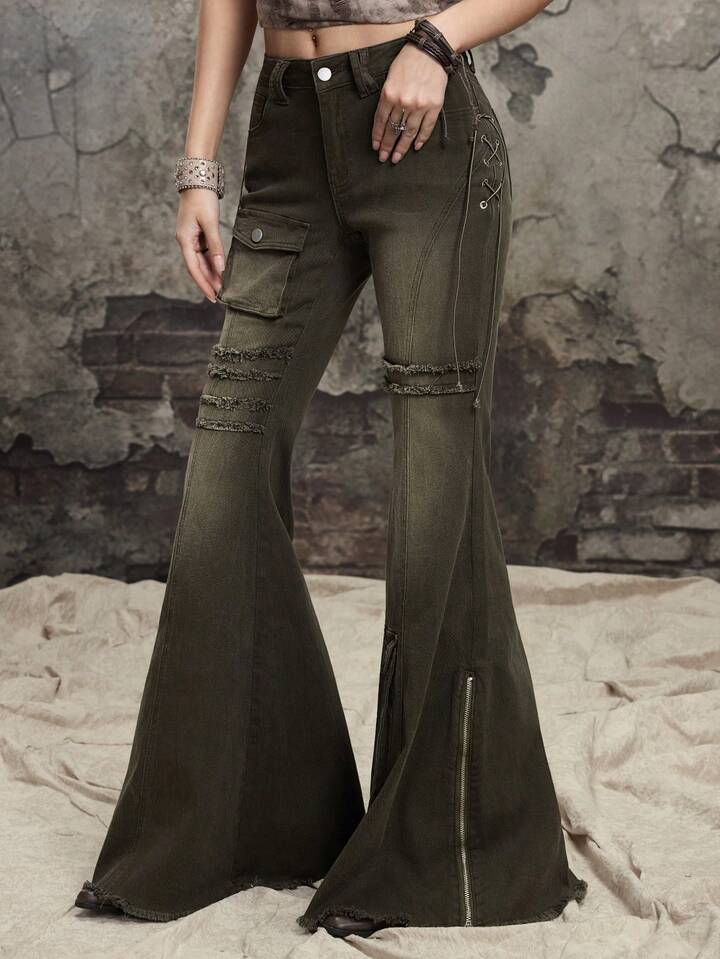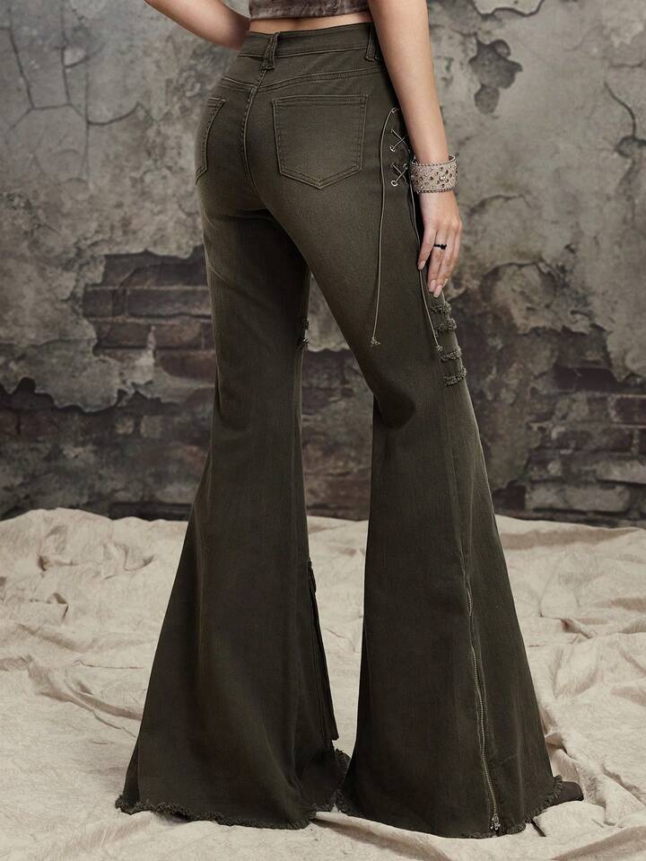Grunge Punk Jeans skinny évasé à taille basse délavé et abîmé pour femmes, inspiré du scavenger post-apocalyptique