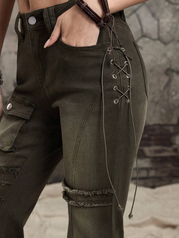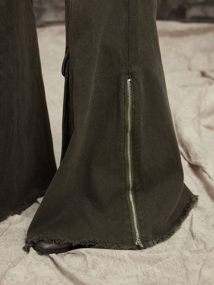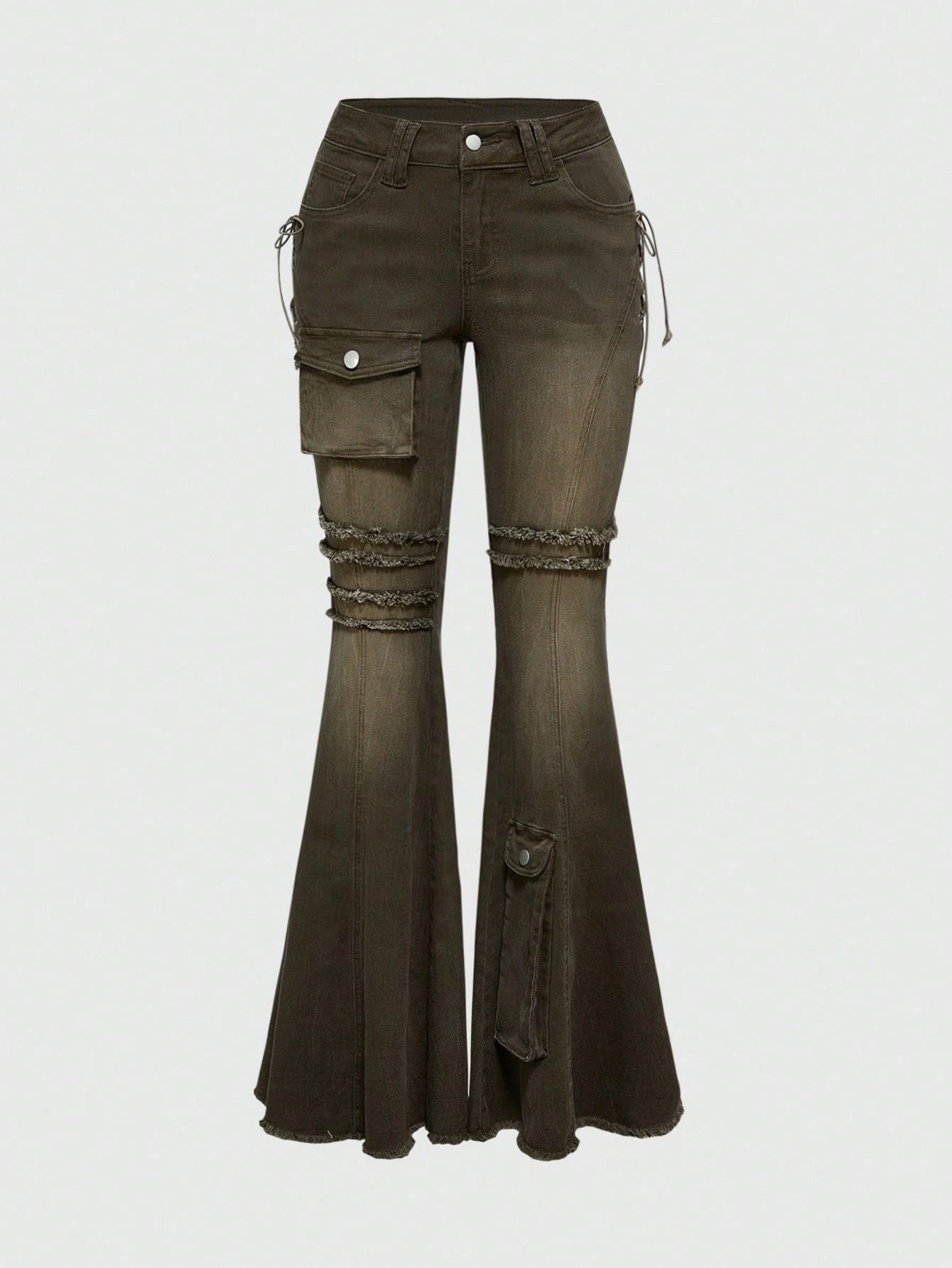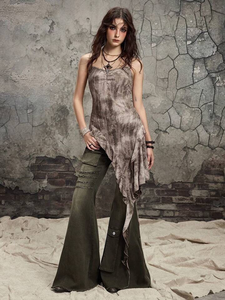 Grunge Punk Jeans skinny évasé à taille basse délavé et abîmé pour femmes, inspiré du scavenger post-apocalyptique