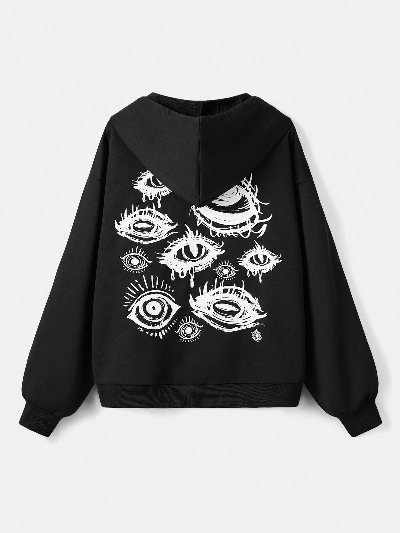 Grunge Punk Sweat-Shirt À Capuche Imprimé Yeux Épaule tombante