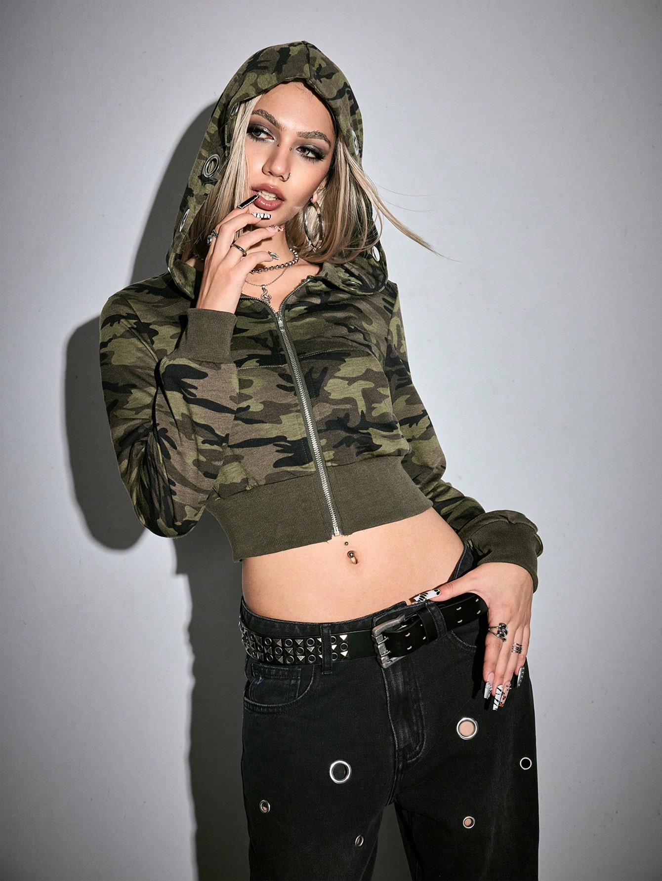 Grunge Punk sweat-shirt à capuche camouflage avec œillets métalliques pour femmes, sweat-shirt court à manches longues