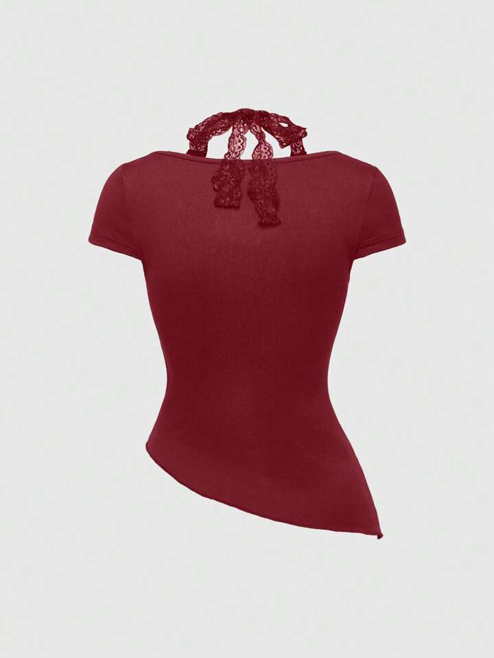 Grunge Punk T-shirt ajusté à col montant pour femmes, patchwork de dentelle avec charme croix gothique