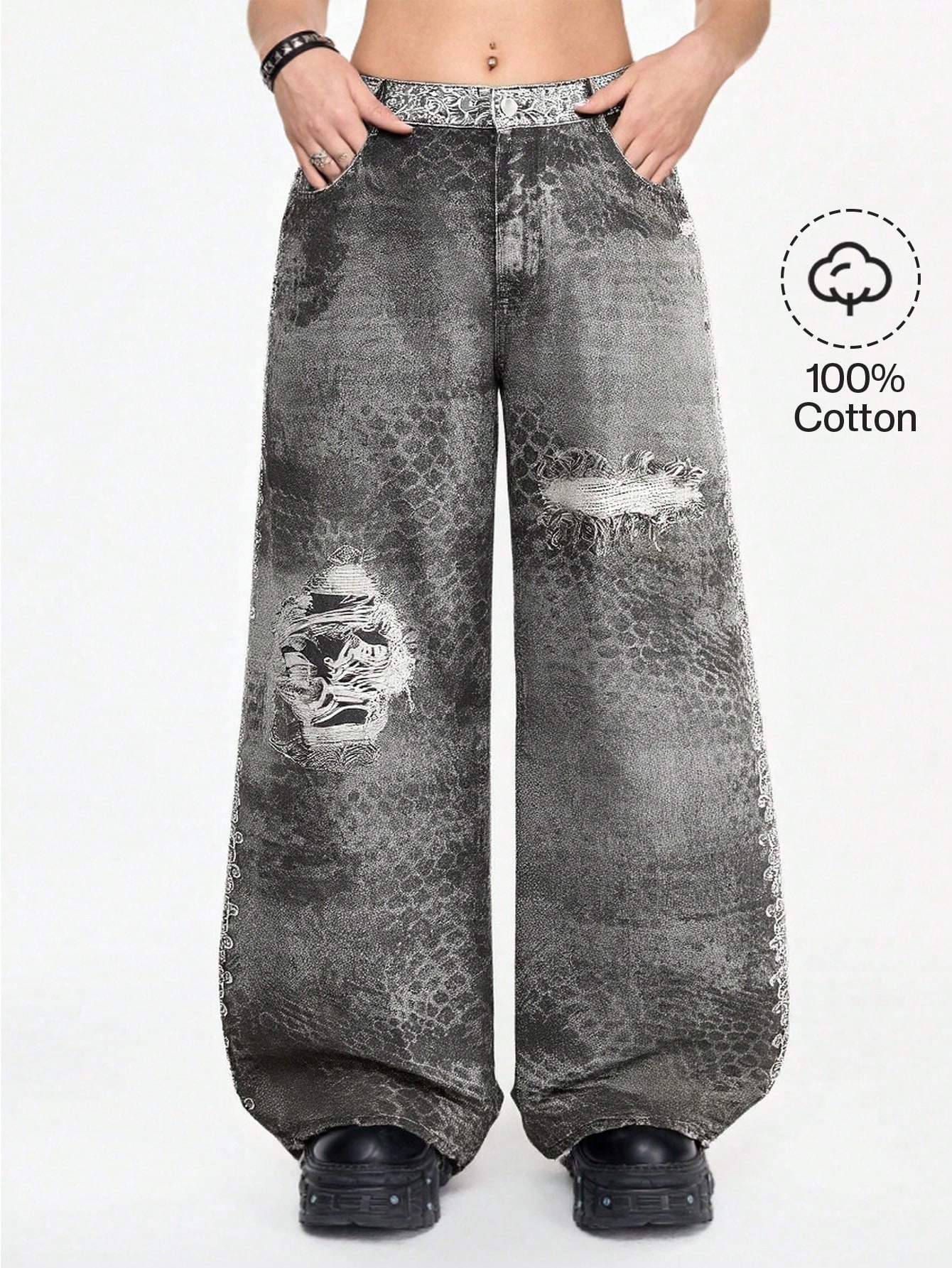 Grunge Punk Jeans effet imprimé animal vintage délavé et déchiré, style grunge-punk, grande taille. Pantalon pour femme