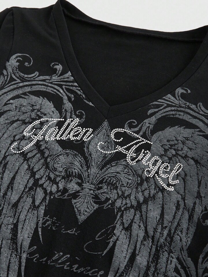 Grunge Punk T-shirt à manches longues ajusté avec imprimé d'aile style grunge, orné de strass
