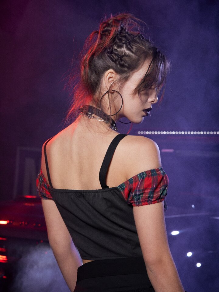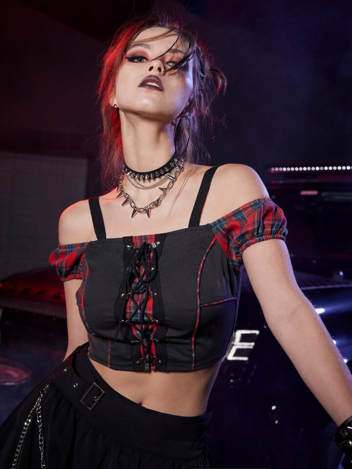 Grunge Punk Blouse à lacets contrastant en tartan à épaules dénudées