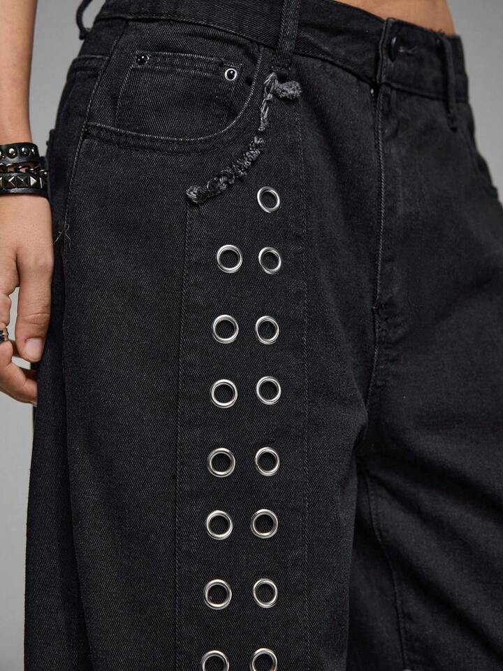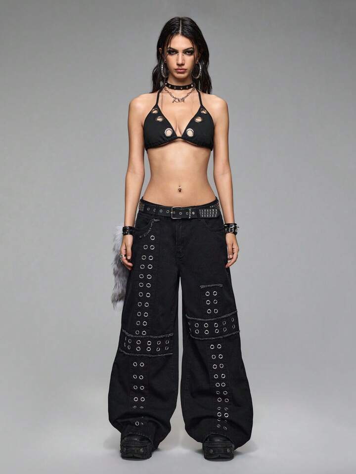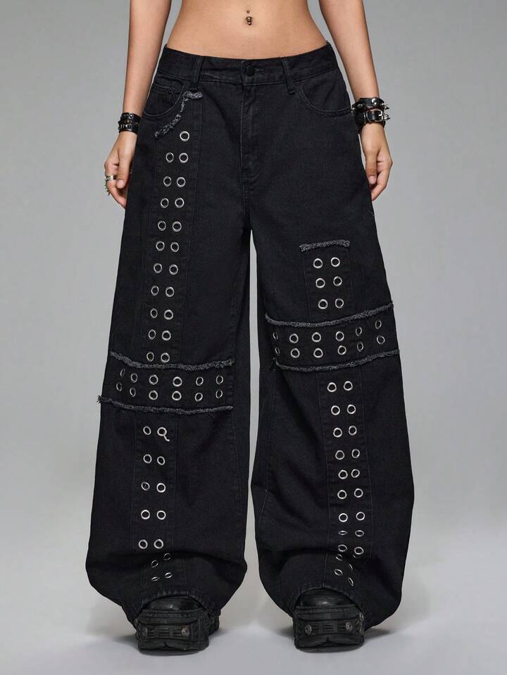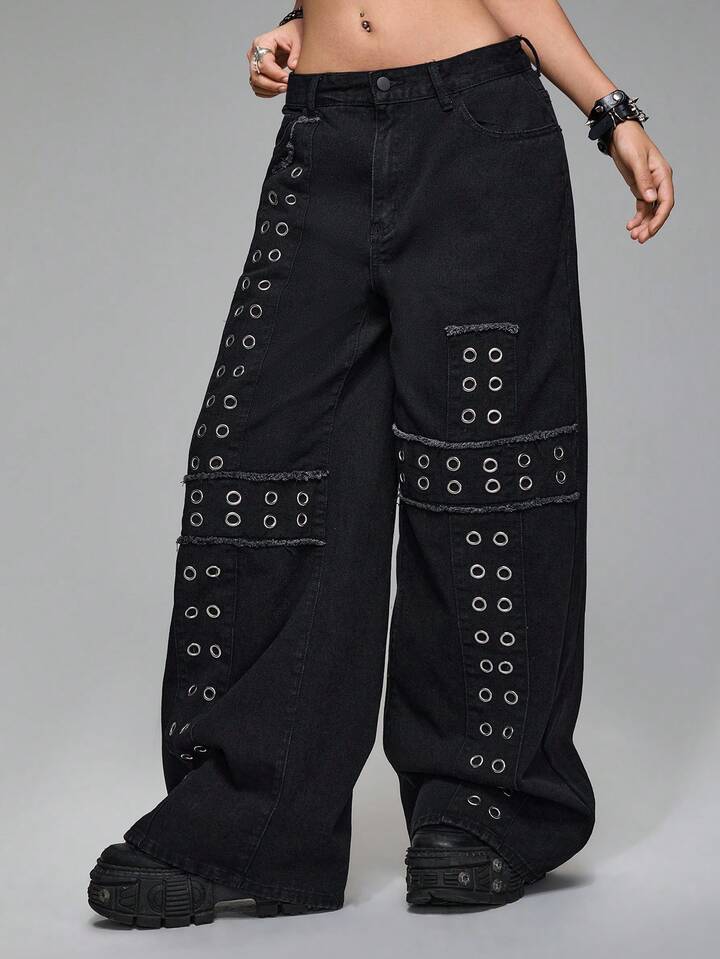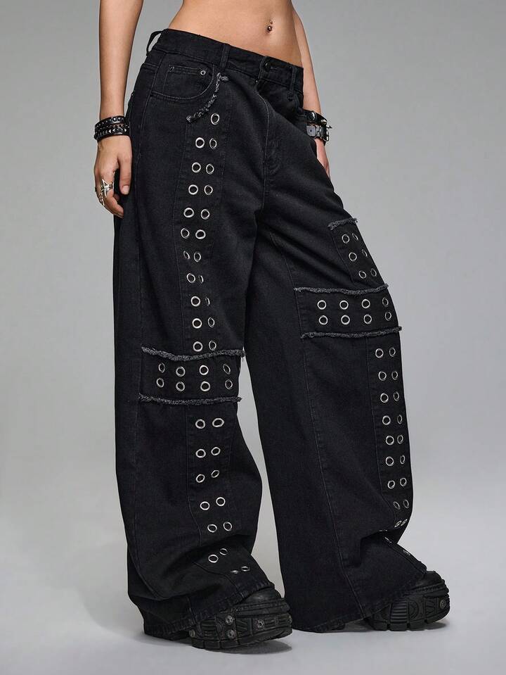 Grunge Punk Jeans larges à taille basse, style punk métal avec rivets, croix brodée