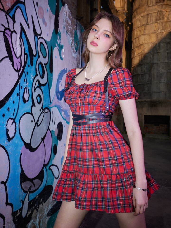 Grunge Punk Robe en tartan à volants à nœud
