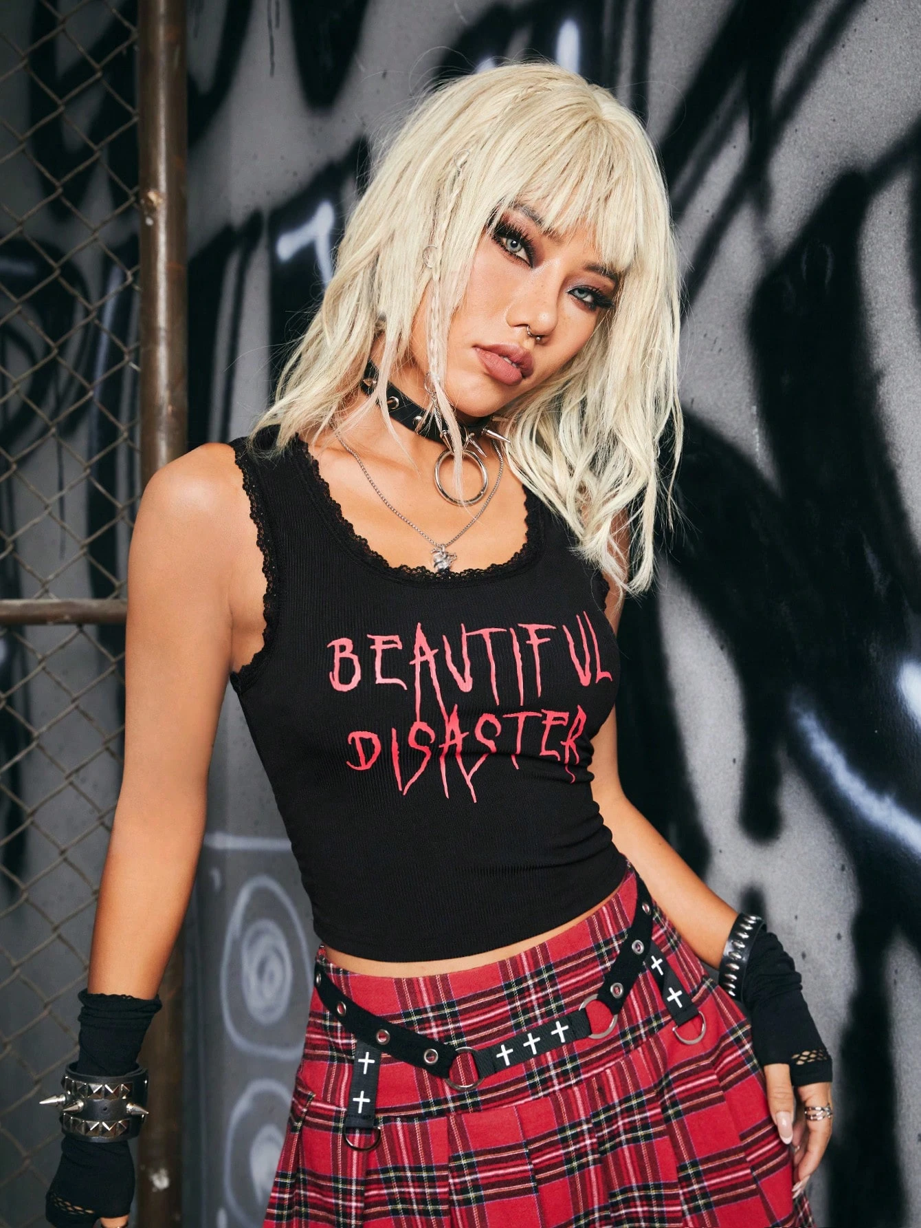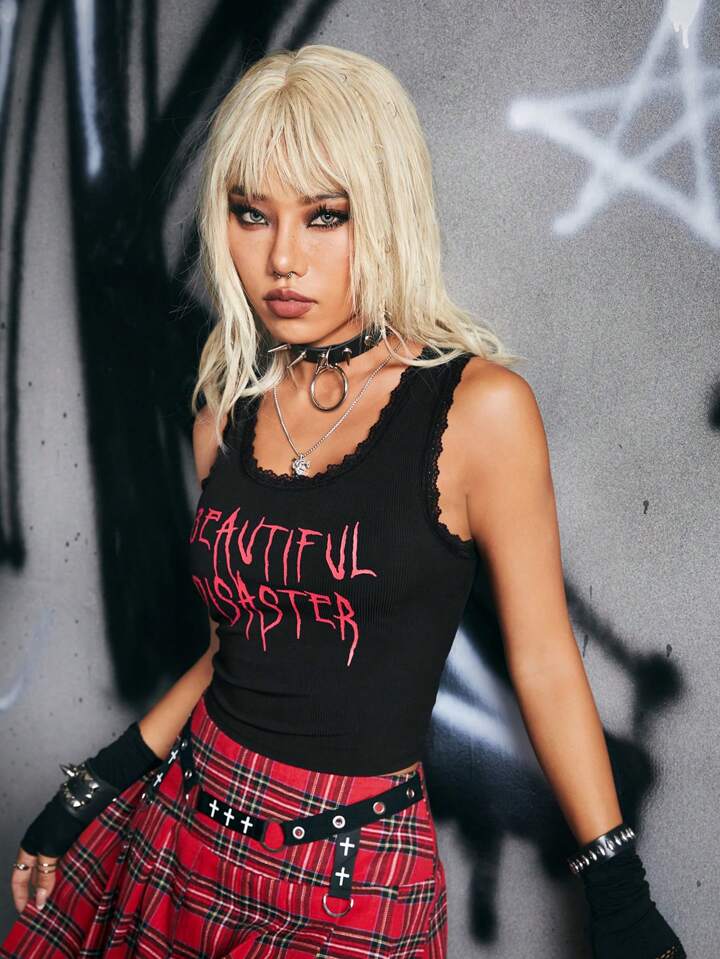 Grunge Punk Top Sans Manches À Lettres Ourlet En Dentelle