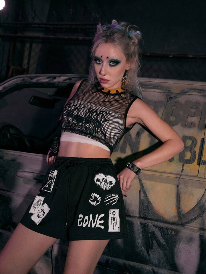Grunge Punk Short lettre à motif tête de mort à cordon