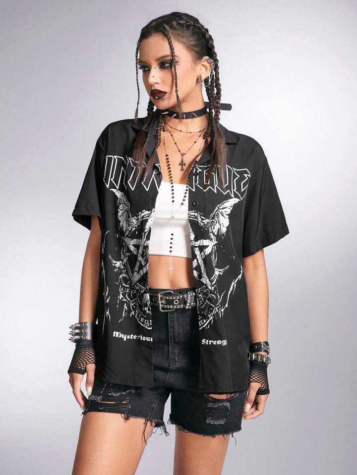 Grunge Punk Chemise Ample À Boutons Avant Imprimée Étoiles Et Lettres, Style De Rue À Encolure En V
